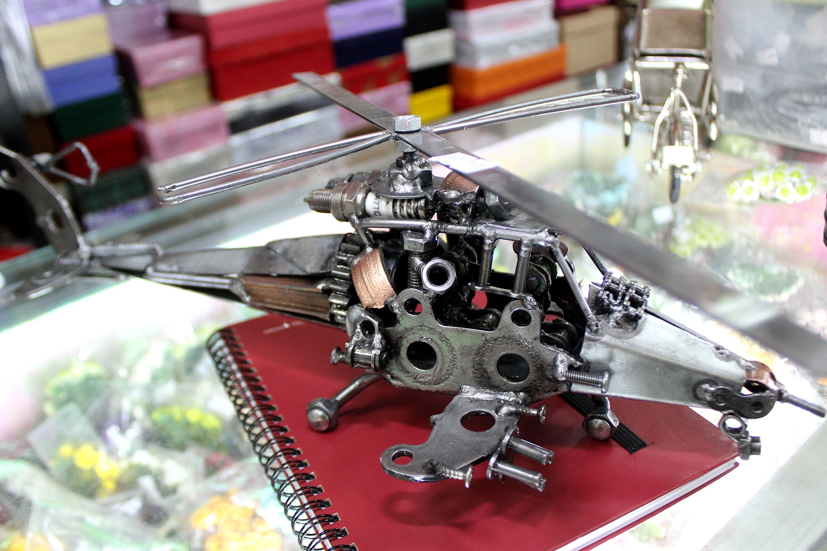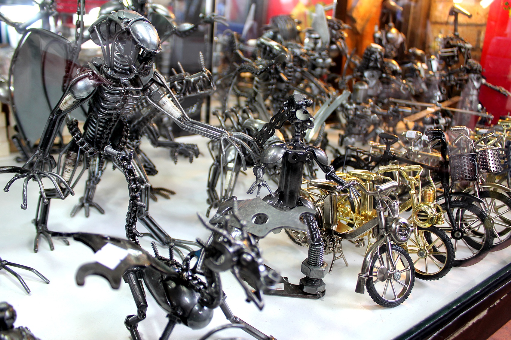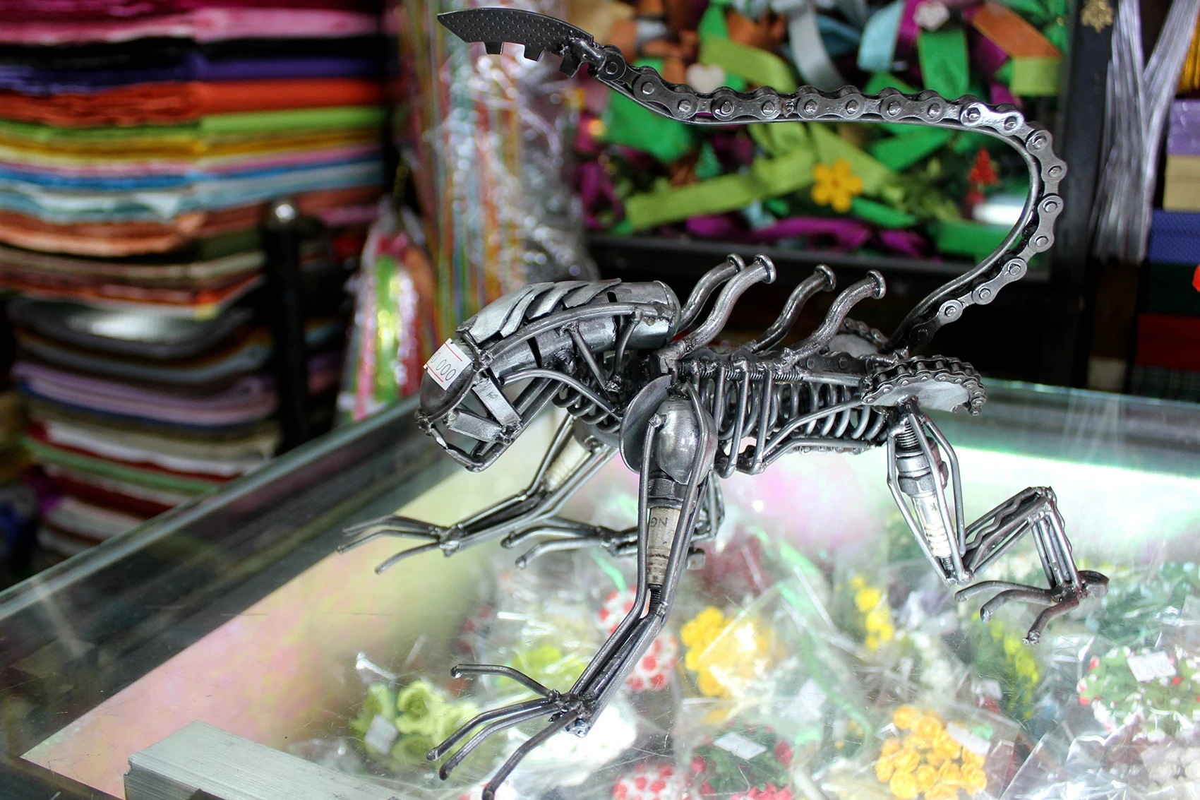 | Ông Tùng, chủ shop lưu niệm trên đường Lê Lợi, quận 1, cho biết: "Tôi đã gắn bó với các món hàng lưu niệm này hơn 15 năm. Đến nay, tôi đã sáng tác hơn 80 mẫu: từ những mô hình đơn giản như xe đạp, xích lô đến nhiều mô hình phức tạp như nhân vật, quái thú được mô phỏng theo những bộ phim nổi tiếng. Phần lớn linh kiện được lấy từ phế liệu của xe gắn máy".