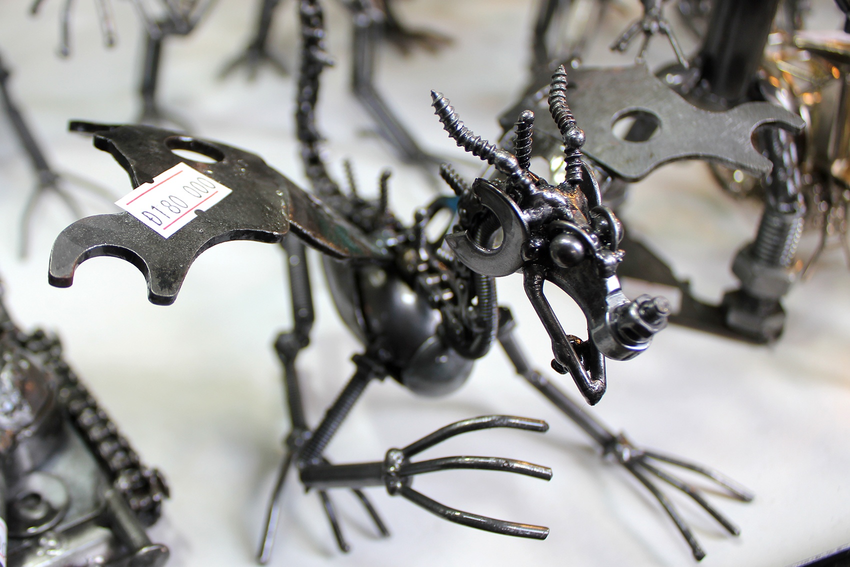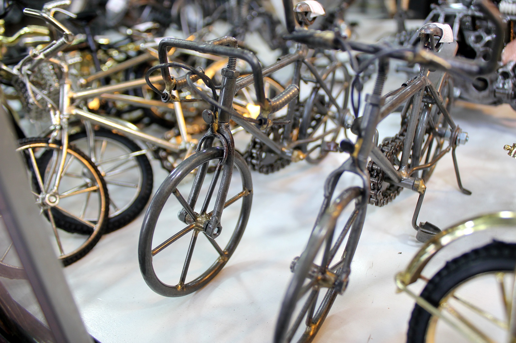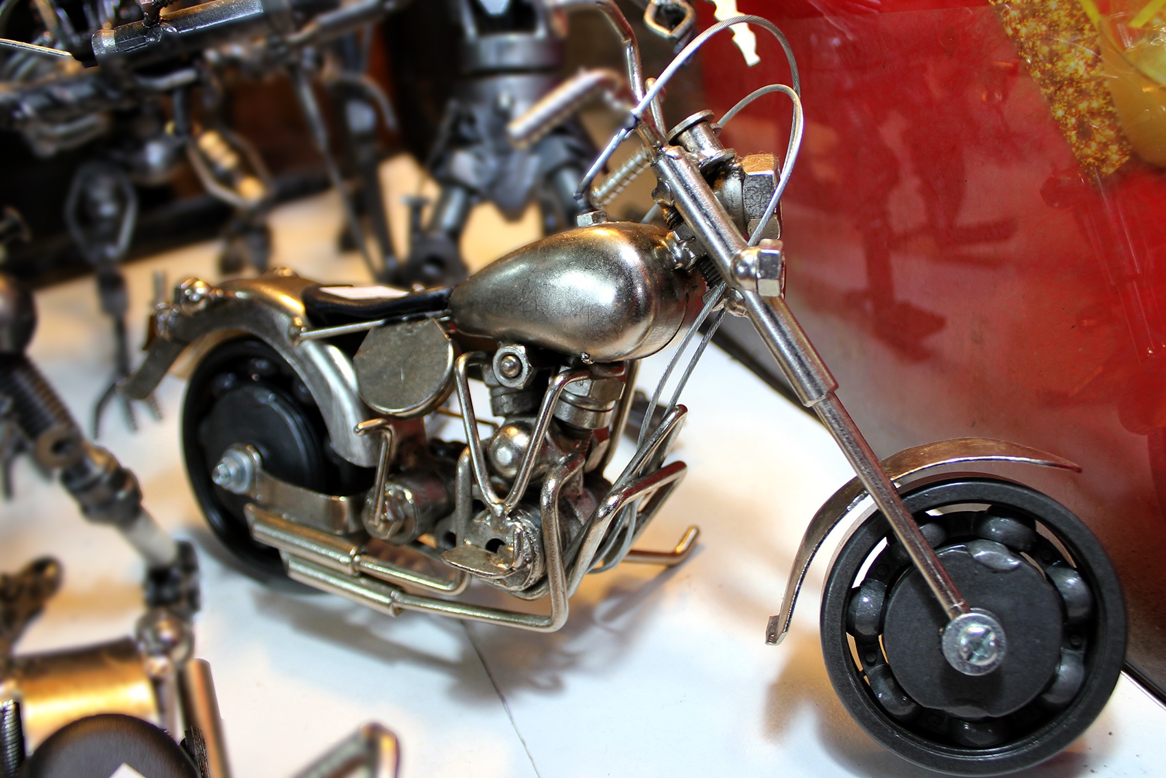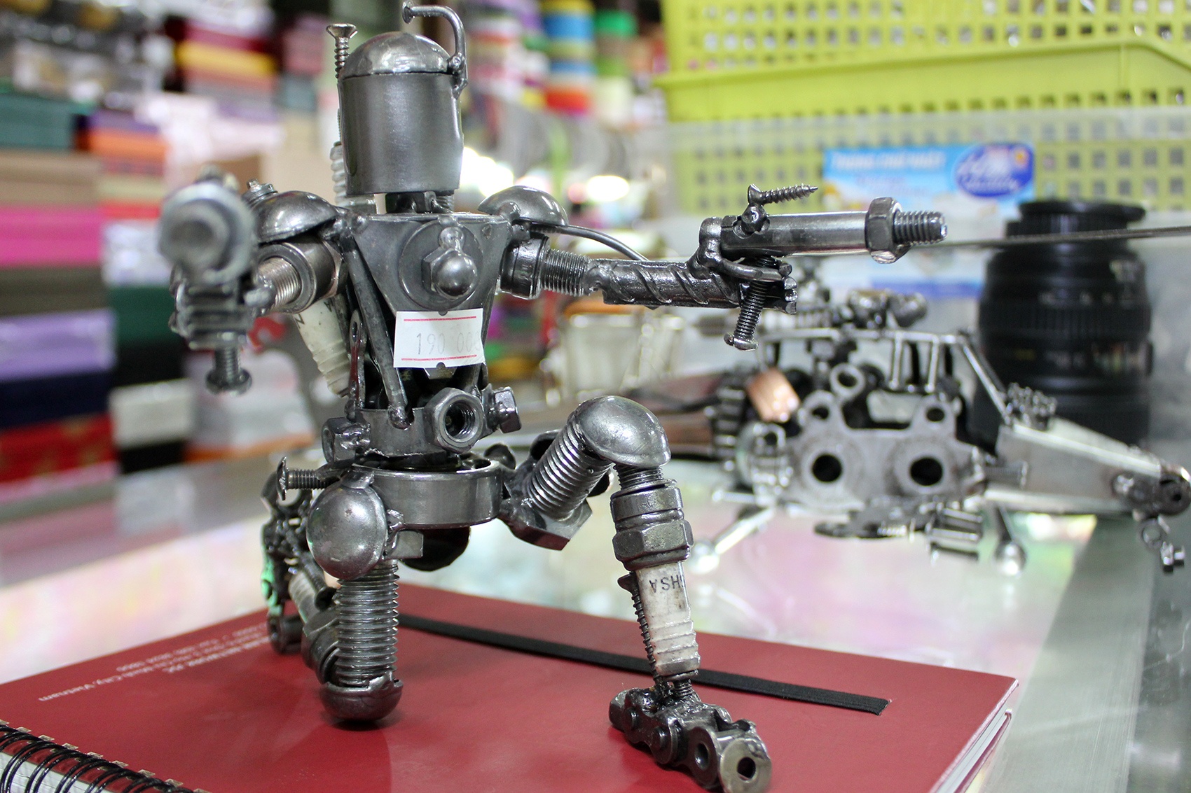 | Ông Tùng, chủ shop lưu niệm trên đường Lê Lợi, quận 1, cho biết: "Tôi đã gắn bó với các món hàng lưu niệm này hơn 15 năm. Đến nay, tôi đã sáng tác hơn 80 mẫu: từ những mô hình đơn giản như xe đạp, xích lô đến nhiều mô hình phức tạp như nhân vật, quái thú được mô phỏng theo những bộ phim nổi tiếng. Phần lớn linh kiện được lấy từ phế liệu của xe gắn máy".