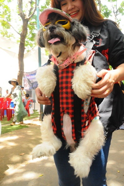 Một bé chó cưng diện đồ ăn chơi đỏm dáng nhất được "mẹ" địu đi chơi ở dog show và được nhiều bạn trẻ chụp ảnh lưu niệm. |