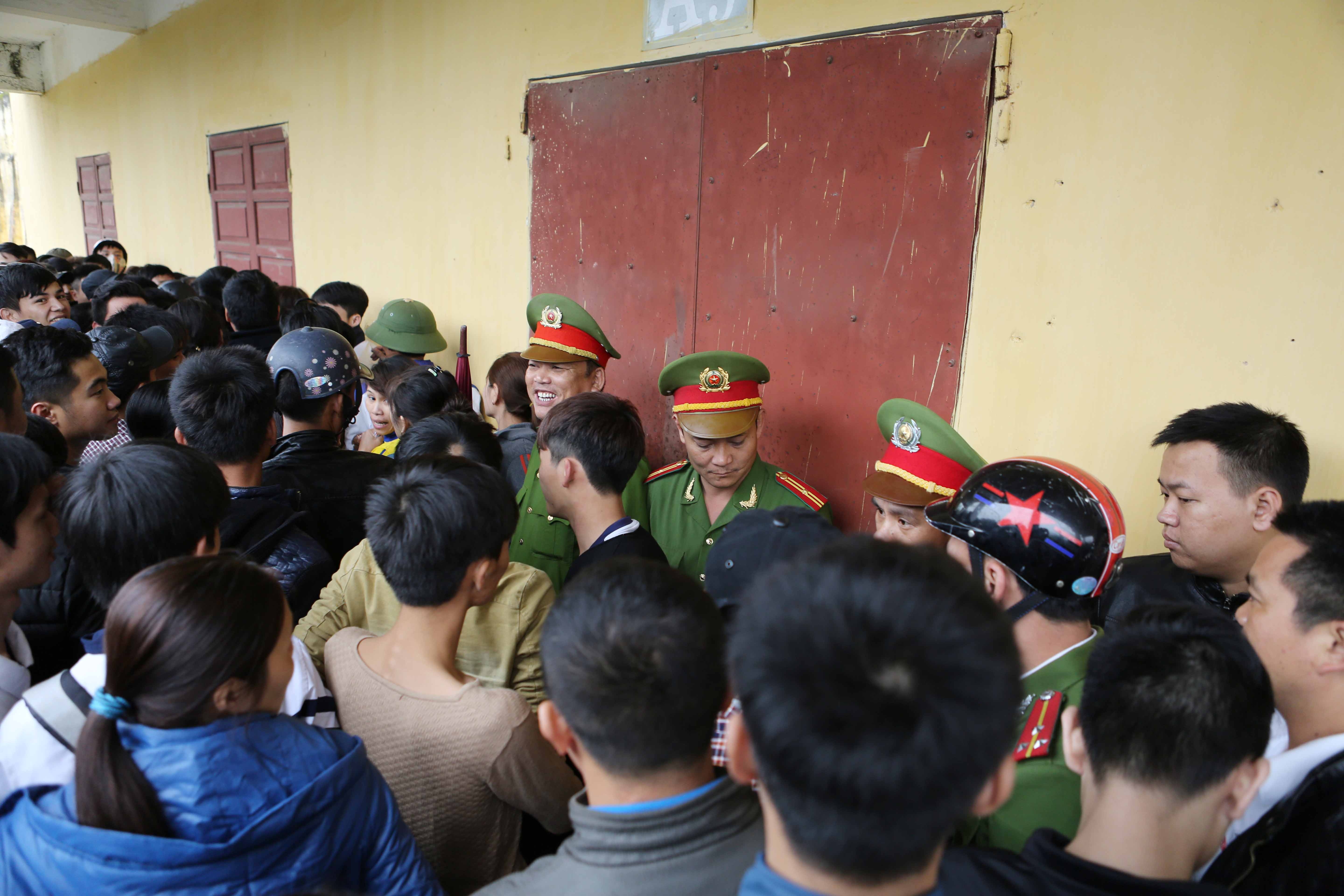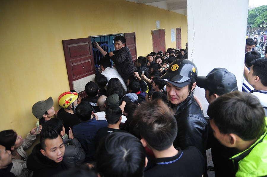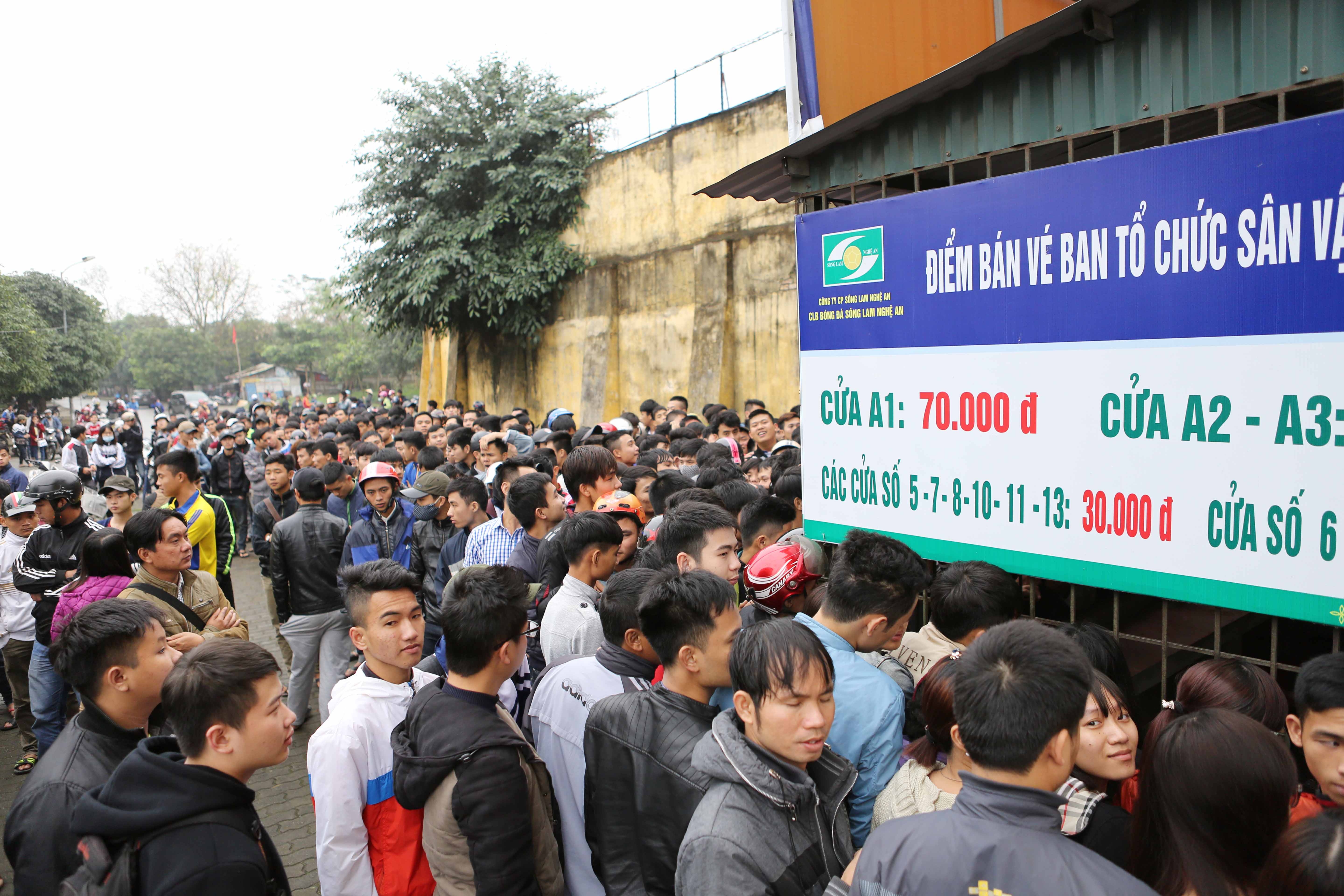 | Nhu cầu mua vé của người hâm mộ quá lớn lớn trong khi ban tổ chức chỉ mở một quầy bán. Tại cửa B sân Vinh, tình cảnh chen lấn, xô đẩy diễn ra rất mất trật tự. |