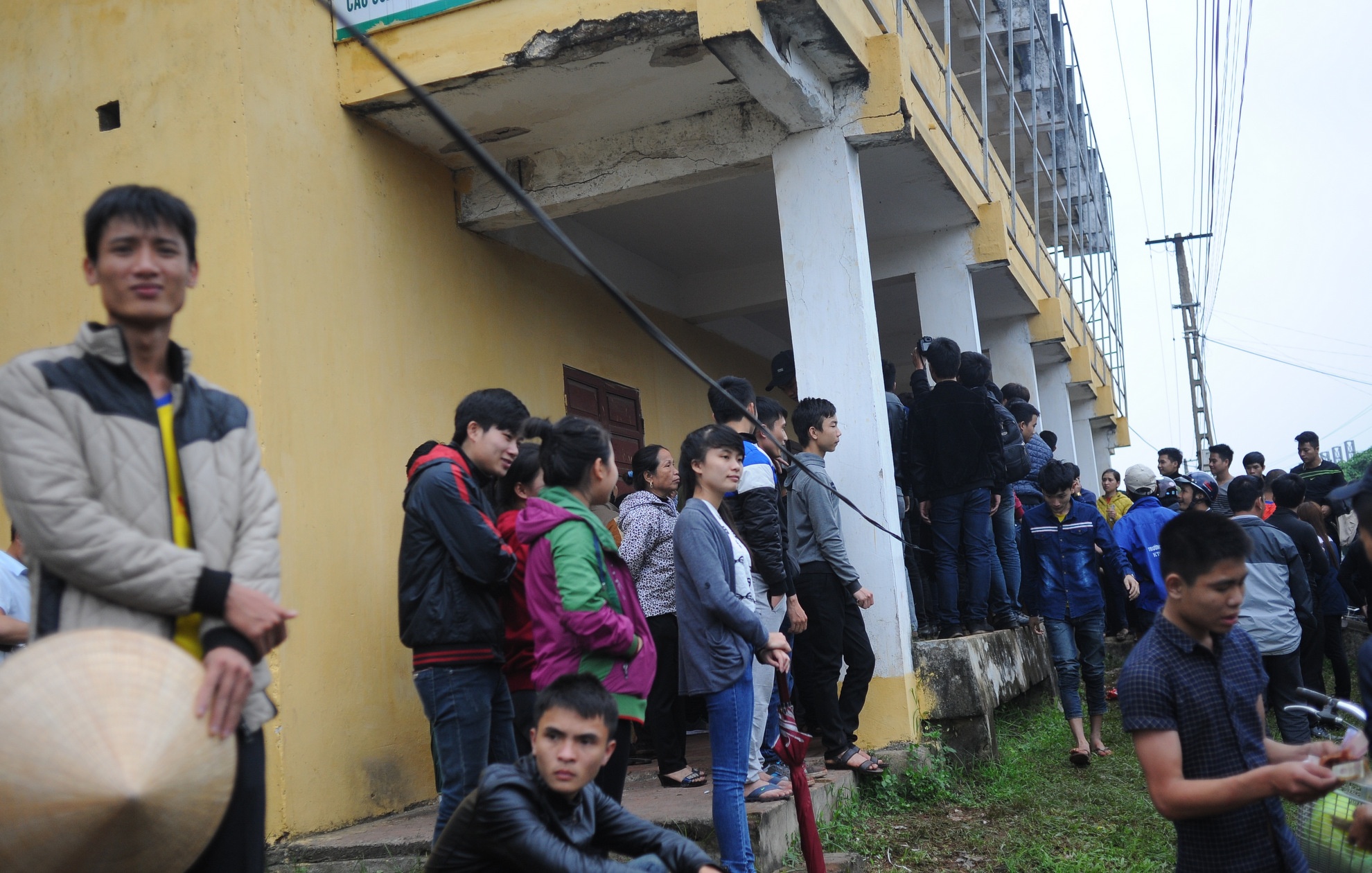 | 15h chiều 11/4, BTC trận đấu SLNA - HAGL trực tiếp mở bán vé tới người hâm mộ tại cổng B sân Vinh. Nhiều CĐV bất chấp nguy hiểm, chen lấn, vén dây điện để tiếp cận cửa bán vé. |
