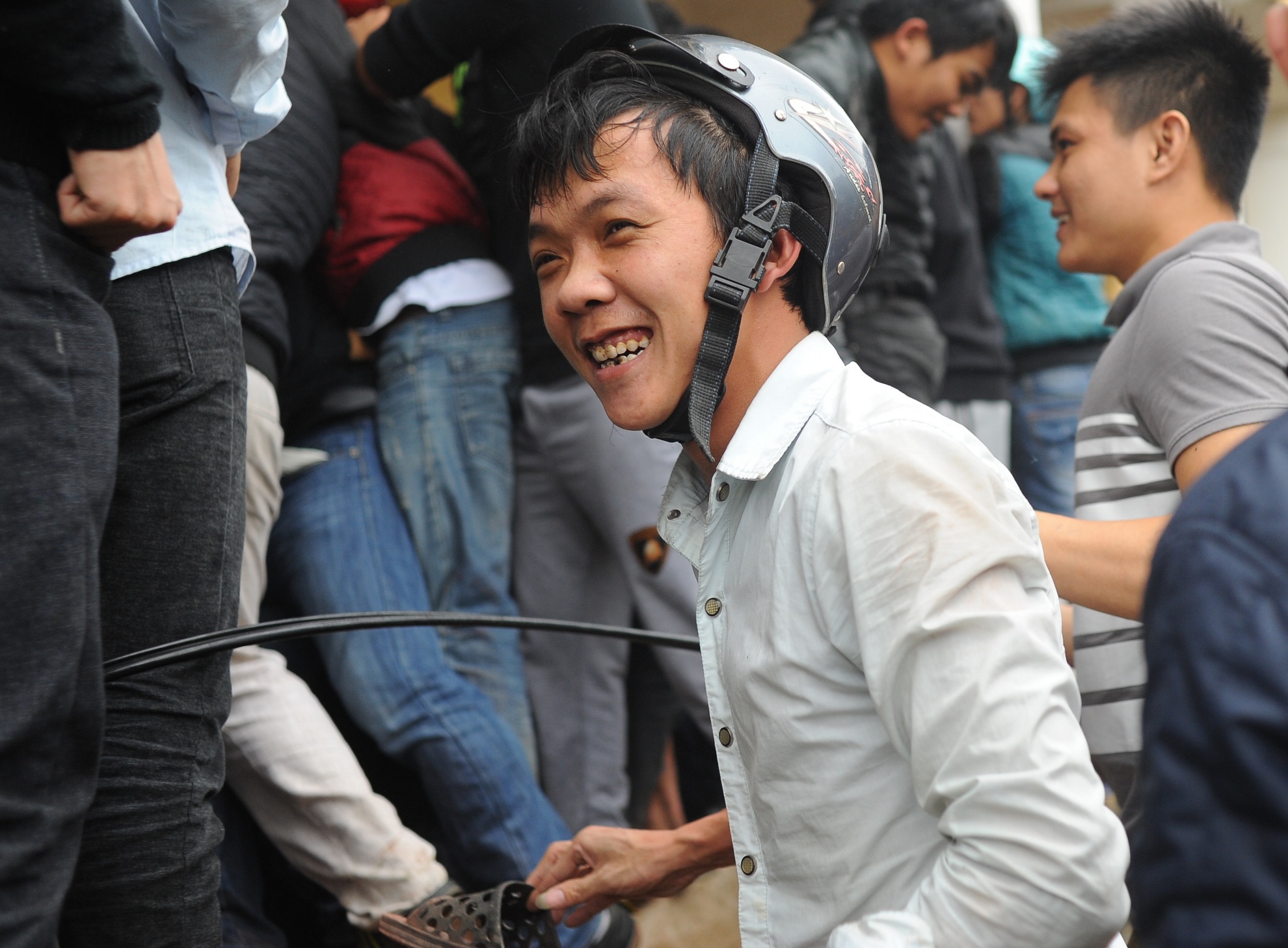 | Một CĐV phấn khởi khi may mắn mua được 1 cặp vé khán đài B với giá gốc. Anh chia sẻ phải đội mũ bảo hiểm vì sợ bị chen lấn, giật tóc trong đám đông. Khoảng 17h30 chiều 11/4, 3.000 vé trận SLNA - HAGL đã được bán hết. Người hâm mộ có nhu cầu tới dự khán nhiều khả năng sẽ phải mua vé từ chợ đen với giá cao hơn nhiều lần. |
