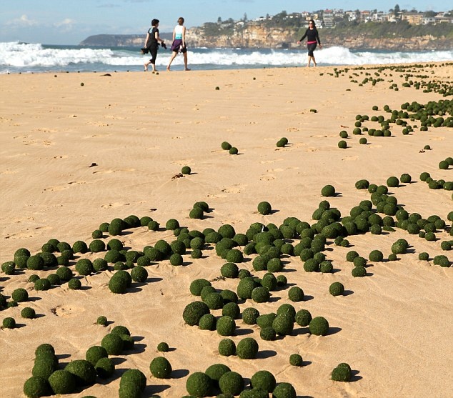 Nhiều khối tròn màu xanh lá cây xuất hiện trên bãi biển Dee Why, thành phố Sydney, Australia. |