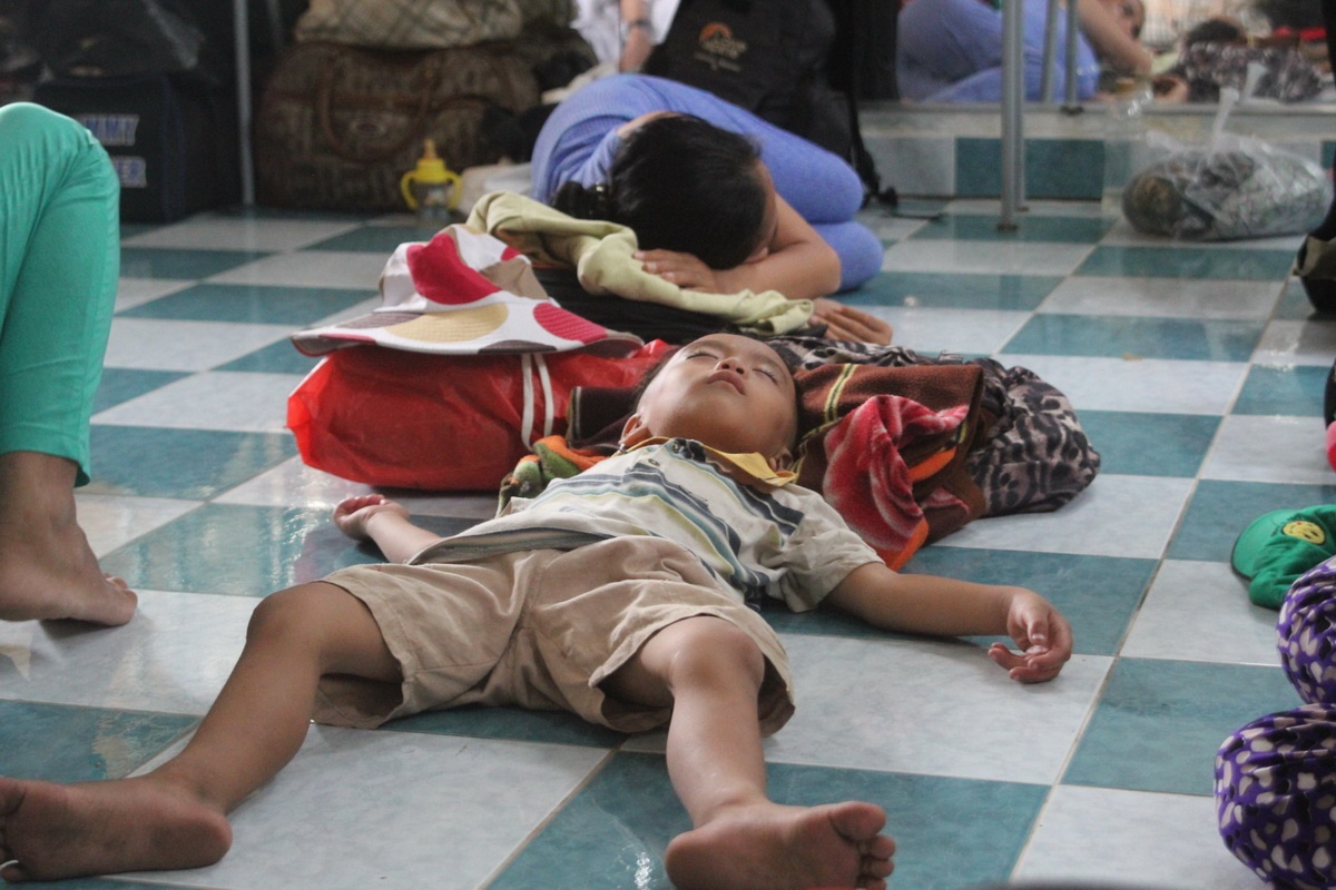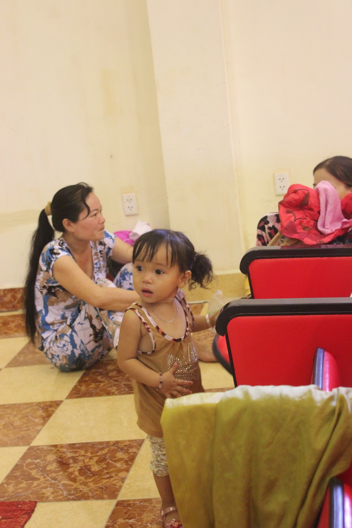 | Bé Gia Hân, 2 tuổi, cùng mẹ đi trú bão. |