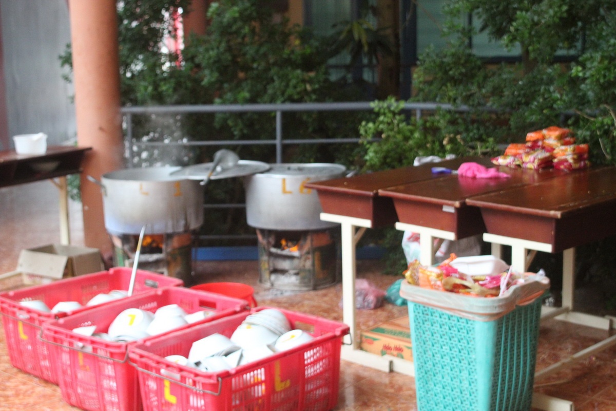 | Mì tôm miễn phí cứu trợ tại nhà văn hóa thiếu nhi. |