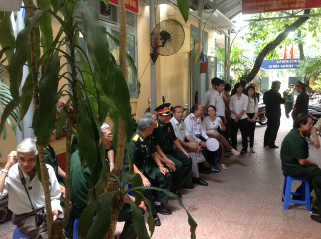 | Các tướng lĩnh cựu chiến binh, sinh viên, người dân xếp hàng chờ tới lượt vào viếng Đại tướng Võ Nguyên Giáp tại trụ sở Hội Cựu chiến binh Q.1. Ảnh Hội Cựu chiến binh Q.1 cung cấp. |
