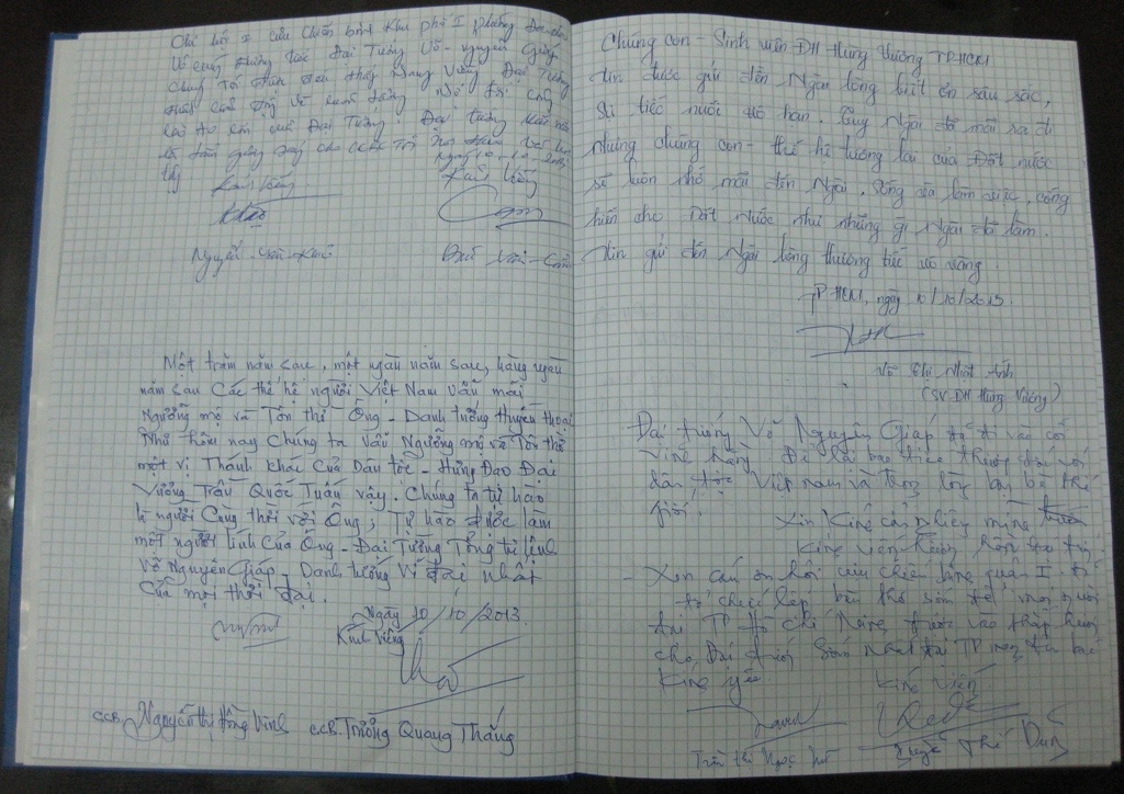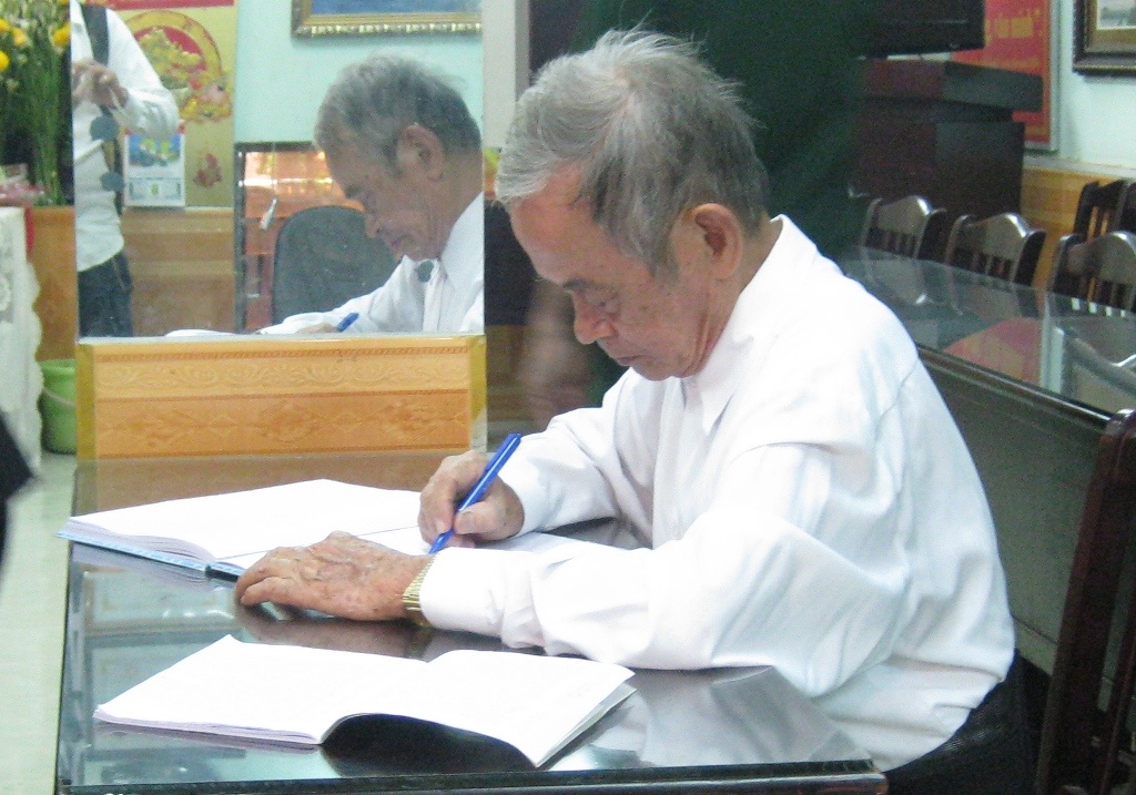 | Một cựu chiến binh ngồi ghi những dòng tưởng niệm Đại tướng Võ Nguyên Giáp. |