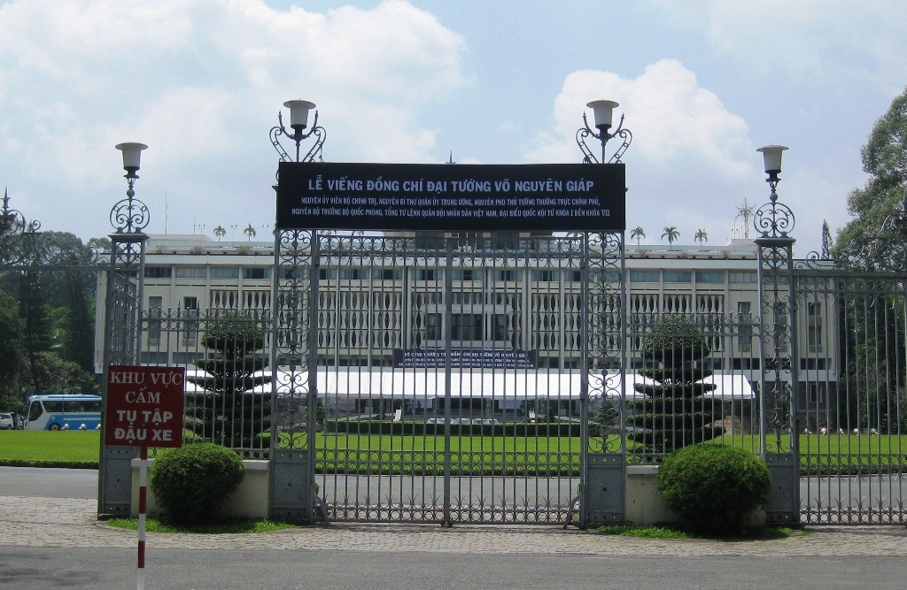 | Dinh Thống Nhất đã sẵn sàng cho Lễ viếng và truy điệu Đại tướng Võ Nguyên Giáp vào sáng mai. |