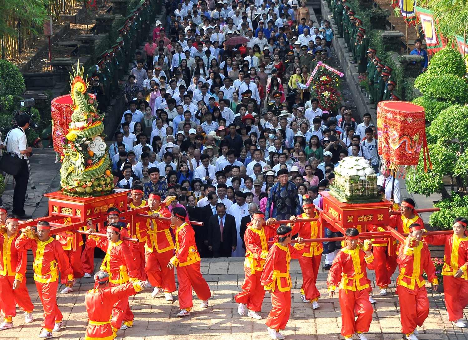 | 8h, sau lễ khai mạc tại quảng trường Công viên Lịch sử - Văn hóa dân tộc (phường Long Bình, quận 9), Ban tổ chức đón rước Lễ tới Khu tưởng niệm các Vua Hùng. Đồ lễ cúng các Vua Hùng năm nay gồm kiệu rước lư hương, kiệu trái cây, kiệu bánh chưng bánh dày. |