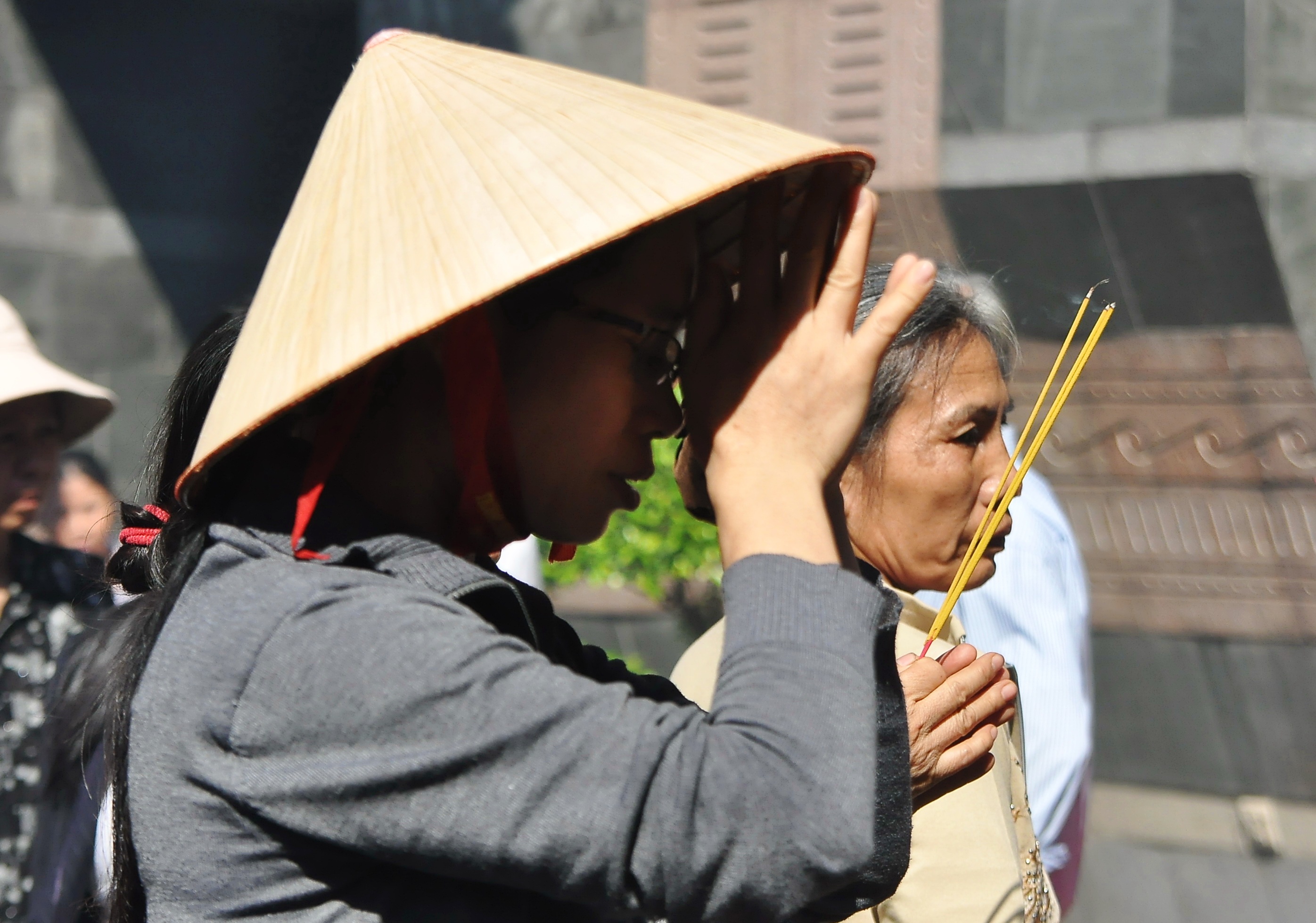 | Trời nắng nóng, người dân phải đội nón nhưng họ vẫn thành kính tưởng niệm các Vua Hùng. |