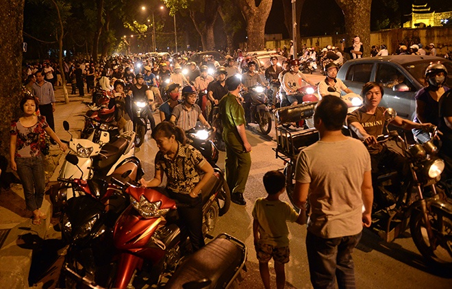 | Phố Hoàng Diệu đã tắc nghẽn, bên Hoàng Thành đã dừng việc trông giữ xe nên nhiều người đã đỗ xe ngay phí dưới lòng đường. |