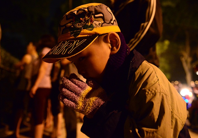 | Cậu bé được mẹ chuẩn bị quần áo ấm áp lặng lẽ viếng "Lạy cụ ạ" trước nhà tướng Giáp. |