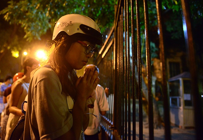| Mặc dù có thông báo đón khách viếng tang Đại tướng vào 8h sáng hôm sau tuy nhiên buổi tối hôm nay vẫn có đông đảo người dân đến trước cổng nhà Tướng Giáp lặng mình kính viếng. |