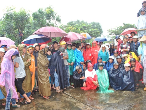 | Hàng ngàn người dân đội mưa để xem tòa xử án. |