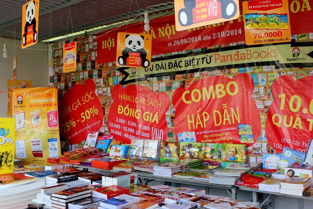 | Tại gian hàng của Pandabooks, tràn ngập những hình ảnh về thông tin ưu đãi như giảm giá sốc từ 20% đến 50%, sách đồng giá chỉ từ 3.000 đồng hay các phần quà hấp dẫn khi bạn đọc mua nhiều sách.
