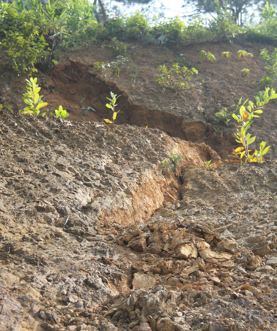 Vết nứt trên sườn núi Cà Vải, xóm Pà Ổ, thị trấn Di Lăng, huyện Sơn Hà (Quảng Ngãi) đã trượt xuống khoảng 30cm. Hàng ngàn m3 đất đá có nguy cơ đổ sập, chôn vùi khoảng 20 người của 4 hộ gia đình xung quanh.