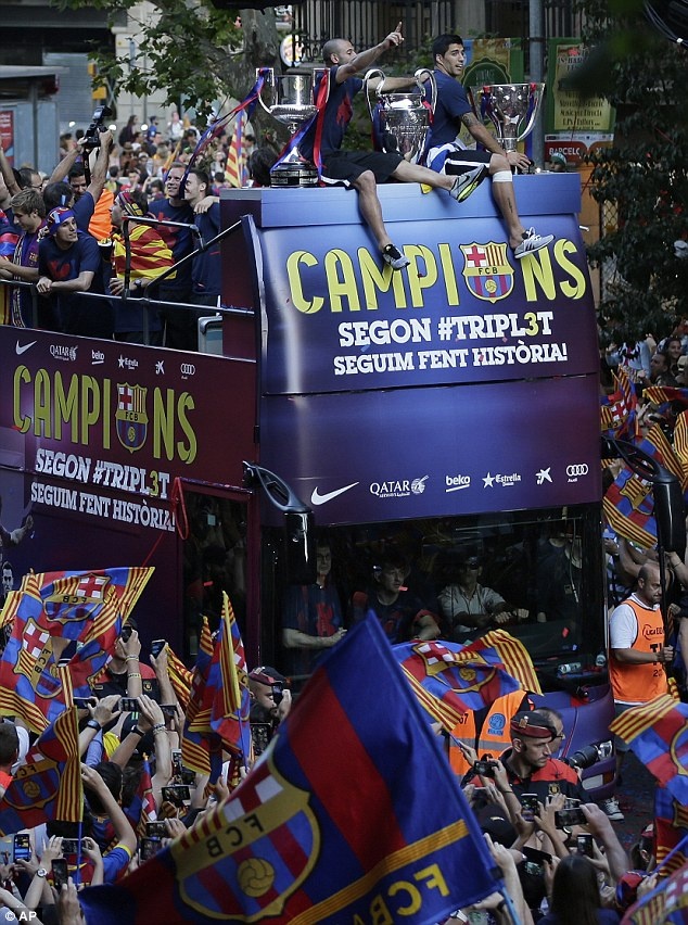| Thầy trò HLV Luis Enrique diễu hành khoe những danh hiệu vừa đạt được trong cuộc diễu hành trên các con phố tại Bercelona. |