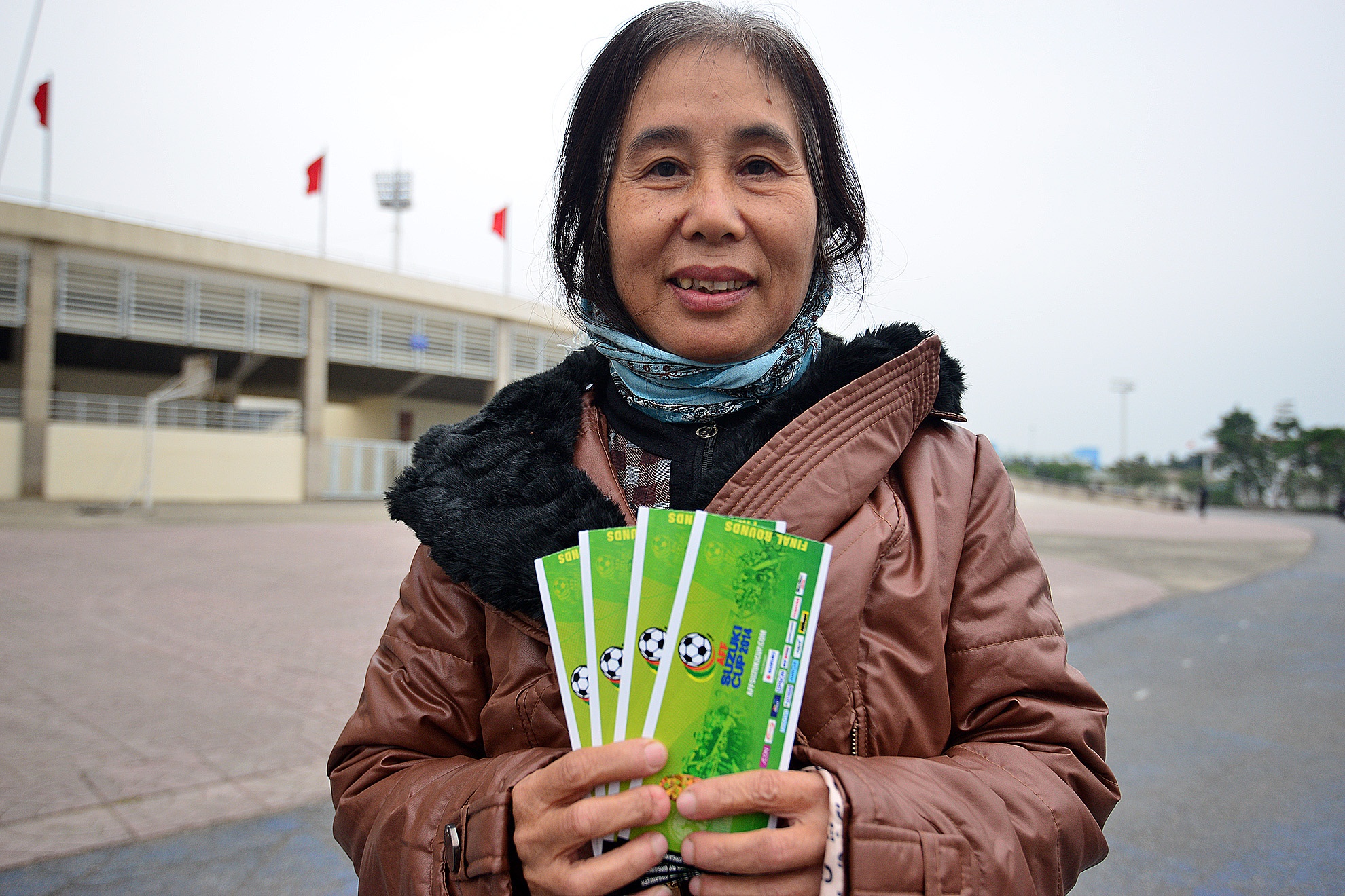 | Còn bà Ngô Thị Quy (Hương Sơn, TP Thái Nguyên) lặn lội từ Thái Nguyên xuống để mua vé. Bà đứng đợi từ 20h ngày 5/12 để sở hữu 4 tấm vé khán đài A. "Lúc tôi đến chưa có ai xếp hàng, khoảng 3h sáng hôm nay mới có vài người đến. Bốn chiếc vé này tặng con và đích thân tôi sẽ đến cổ vũ cho đội nhà", bà tâm sự. |