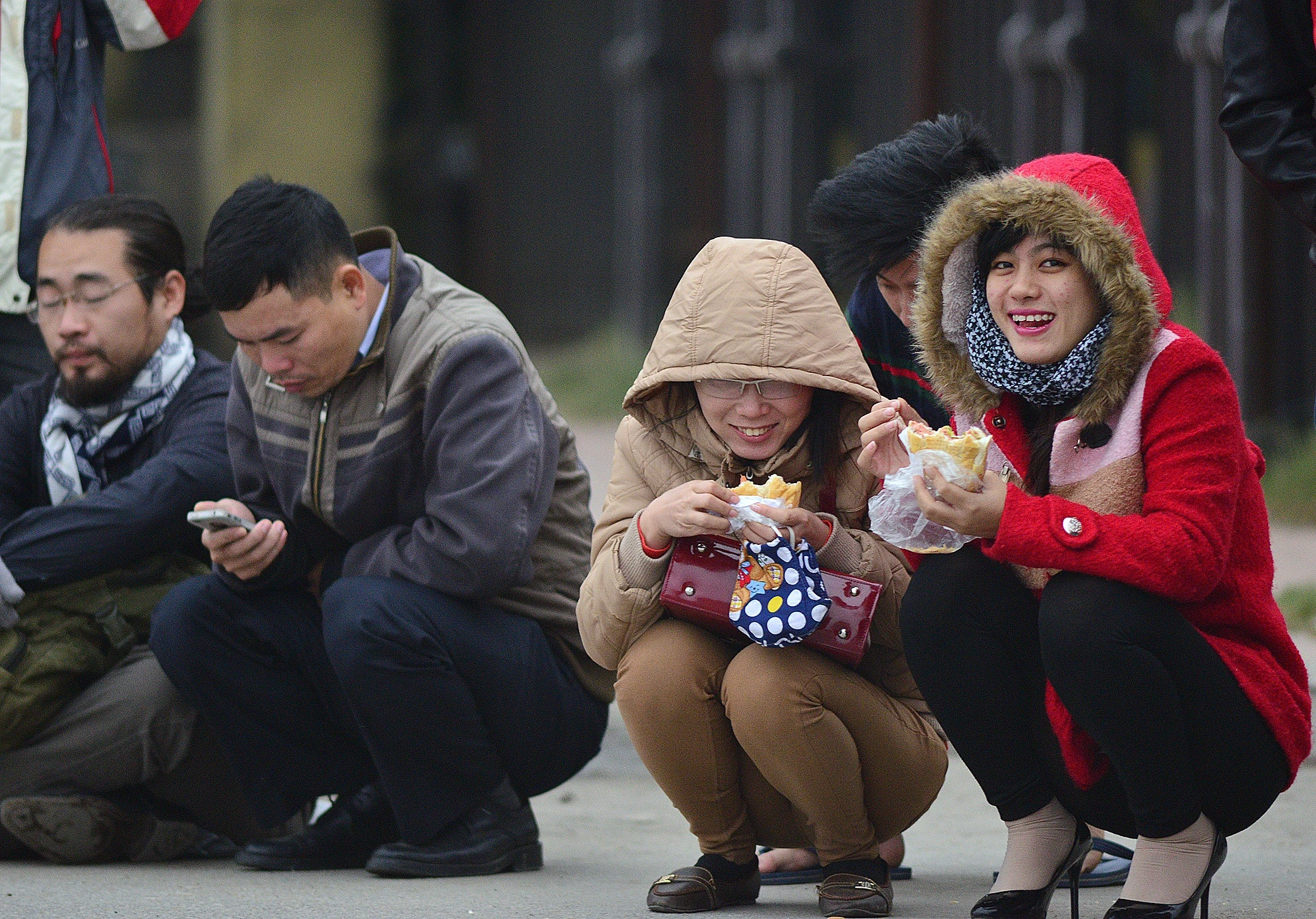 | Mọi người quá mệt do chen chúc nên ngồi xuống trước cổng. Lần lượt từng người sẽ vào trong lấy ticket rồi mua vé. |