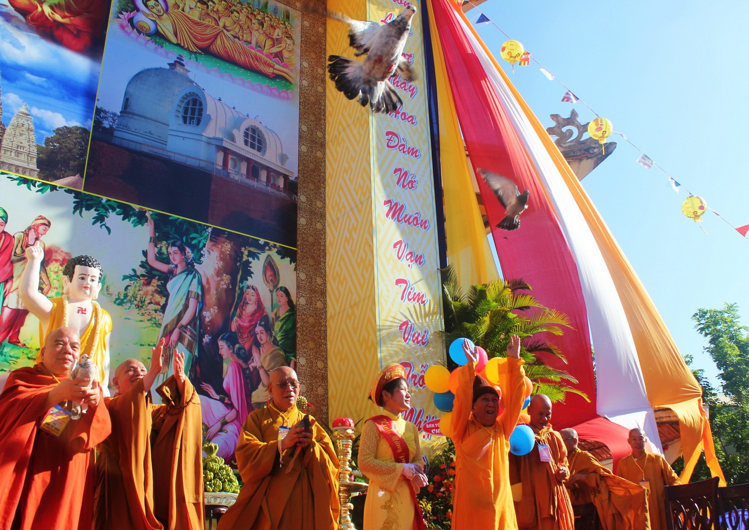 | Chư tôn đức giáo phẩm chứng minh cùng các đại biểu thả chim bồ câu, bong bóng mừng Phật đản với thông điệp cầu nguyện hoà bình thế giới, quốc thái dân an. |
