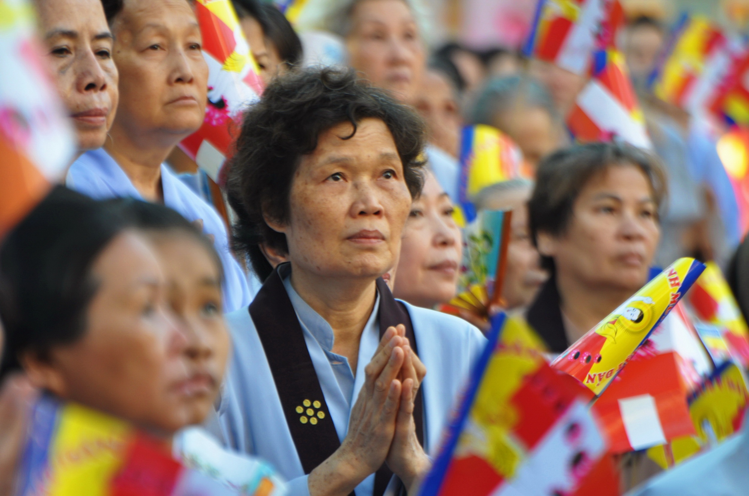 | Các Phật tử trang nghiêm nghe Hòa thượng Thích Đức Nghiệp, Phó Pháp chủ Hội đồng Chứng minh GHPGVN, tuyên đọc Thông điệp Đại lễ Phật đản PL 2558 - Vesak LHQ 2014. |