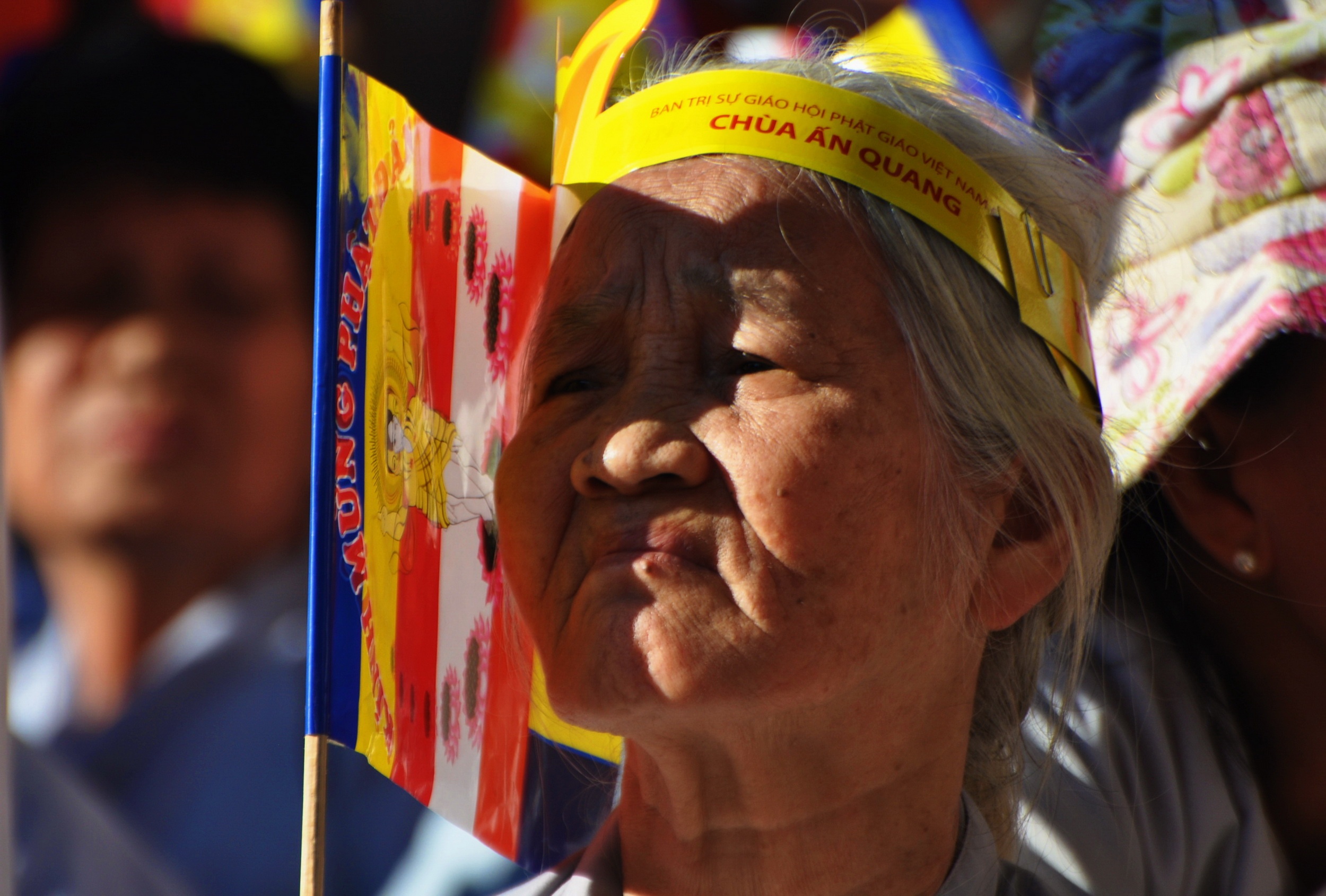 | Một Phật tử dùng cờ mừng Phật đản để che nắng khi theo dõi buổi lễ trong sân Việt Nam Quốc Tự. |