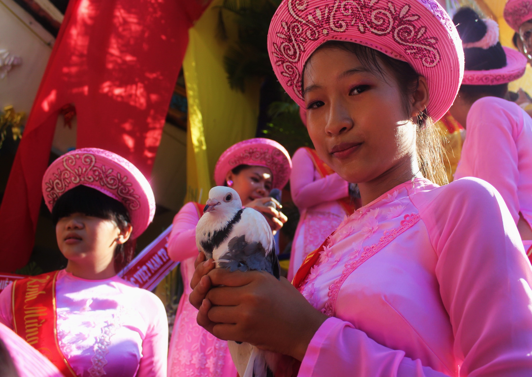 | "Đại lễ Phật đản Liên Hiệp Quốc năm nay là dịp để cùng nhau nhìn nhận và đánh giá lại những cố gắng của cộng đồng thế giới có niềm tin vào triết lý của Đức Phật trong việc xây dựng và phát triển xã hội trong hoà bình, hữu nghị, thắt chặt sự đoàn kết, cùng nhau kiến tạo một xã hội tốt đẹp, cõi Niết bàn trong hiện thực của thế giới hiện tại, góp phần ngăn chặn các cuộc chiến tranh và đẩy lùi nguy cơ nghèo đói, đau khổ, đưa con người tới cuộc sống an vui...", ông Hứa Ngọc Thuận, Phó Chủ tịch UBND TP, phát biểu tại buổi lễ. Ảnh: Các thiếu nữ chuẩn bị chim bồ câu để thả cầu nguyện hòa bình trong Đại lễ. |