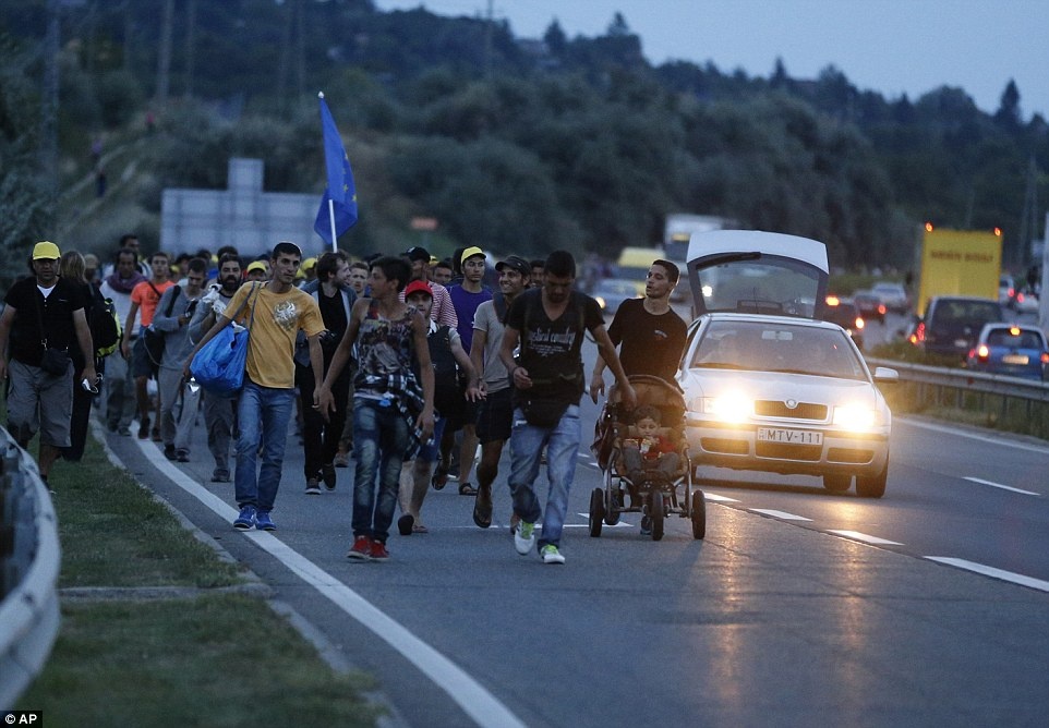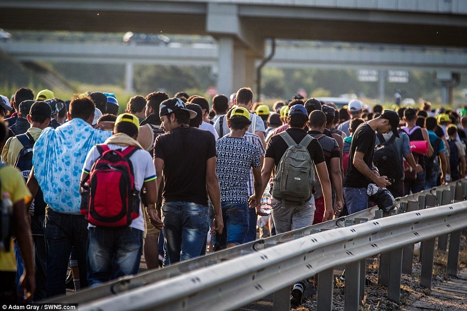 Không thể lên những đoàn tàu hướng tới phía tây châu Âu, người di cư từ Trung Đông và châu Phi quyết định đi bộ tới biên giới Hungary – Áo trong hành trình tới châu Âu. Họ phải vượt qua quãng đường khoảng 160 km từ thủ đô Budapest tới biên giới. Ảnh: AP |