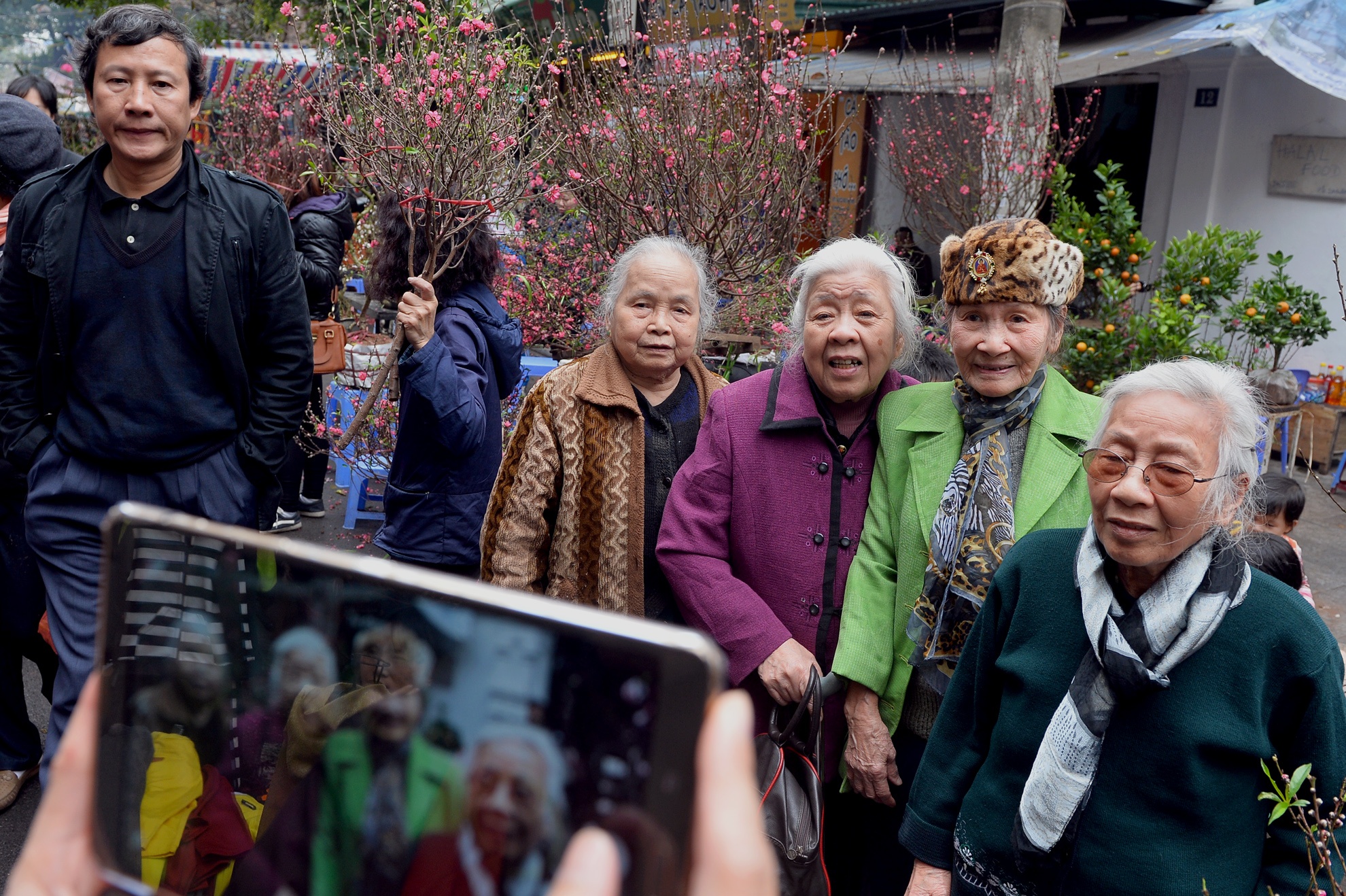 | Nhóm các cụ bà cao tuổi sinh sống tại phố Hàng Lược cũng mặc diện ra chợ chụp ảnh kỷ niệm. 'Ngày thường phố xá chẳng có gì đẹp để chụp, hôm nay ngày đầu các con cháu nghỉ ngơi mới có thời gian để mấy bà bạn già chúng tôi lưu lại khoảnh khắc đẹp cùng chợ hoa', một cụ nói. |