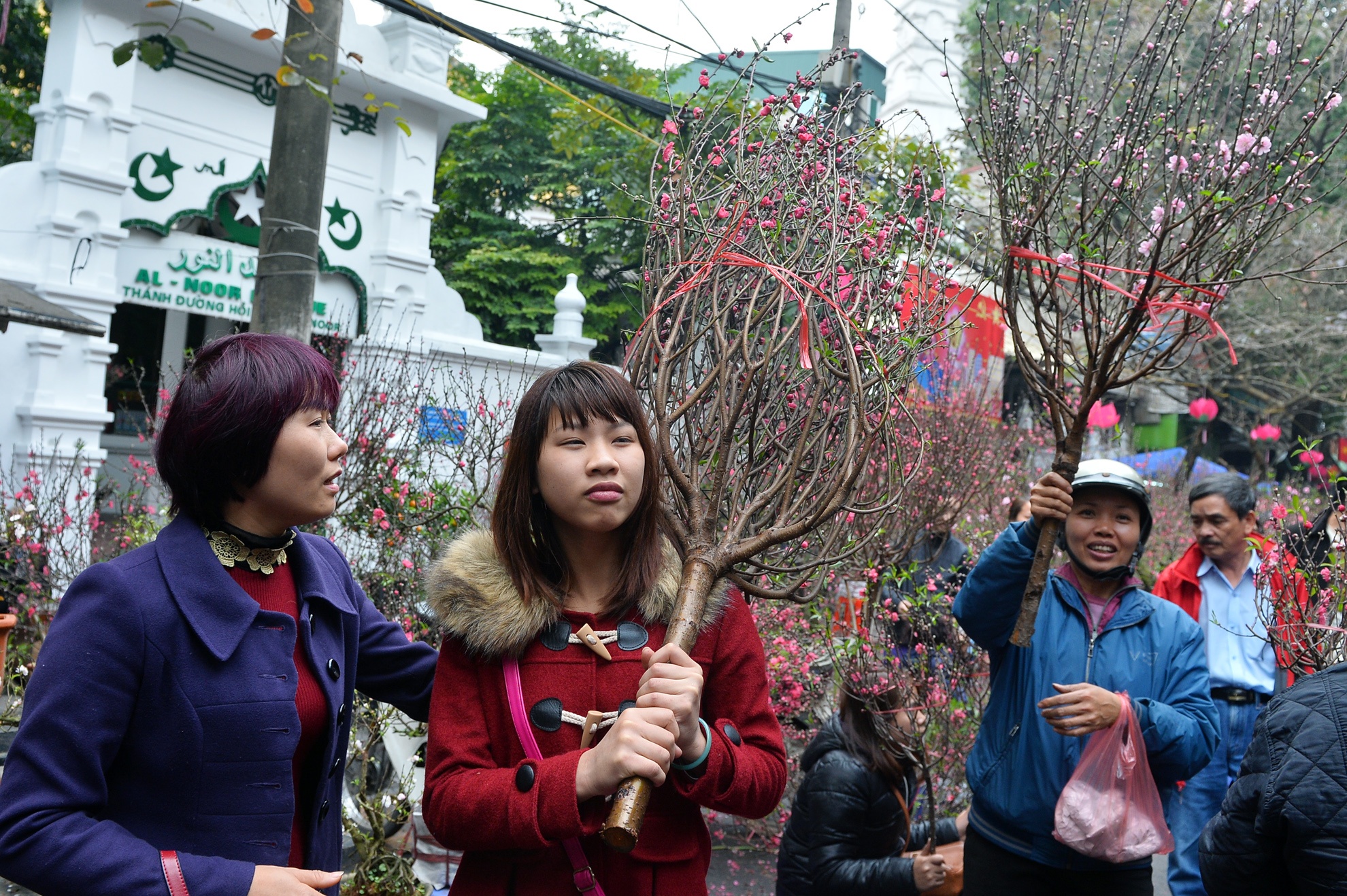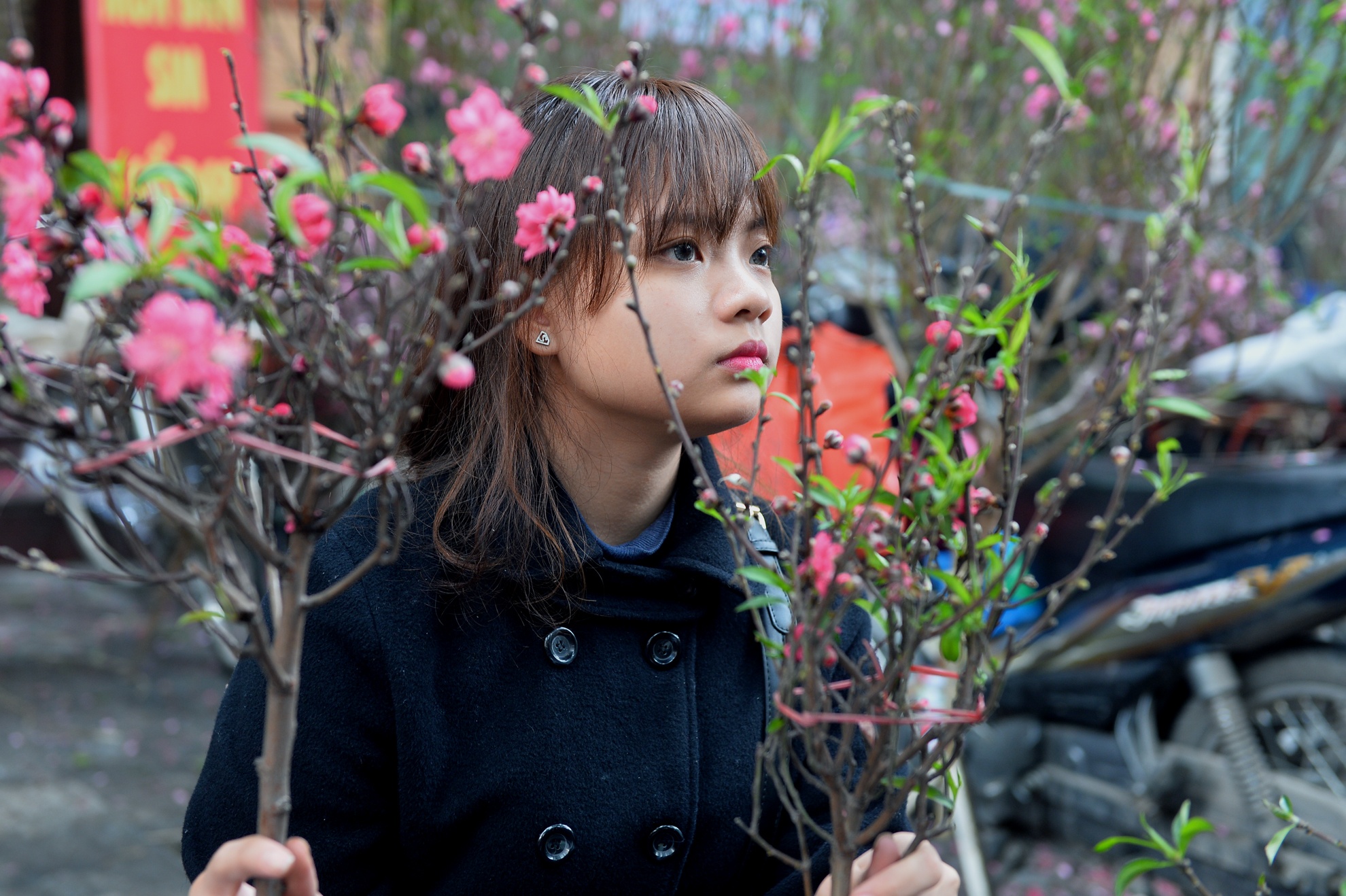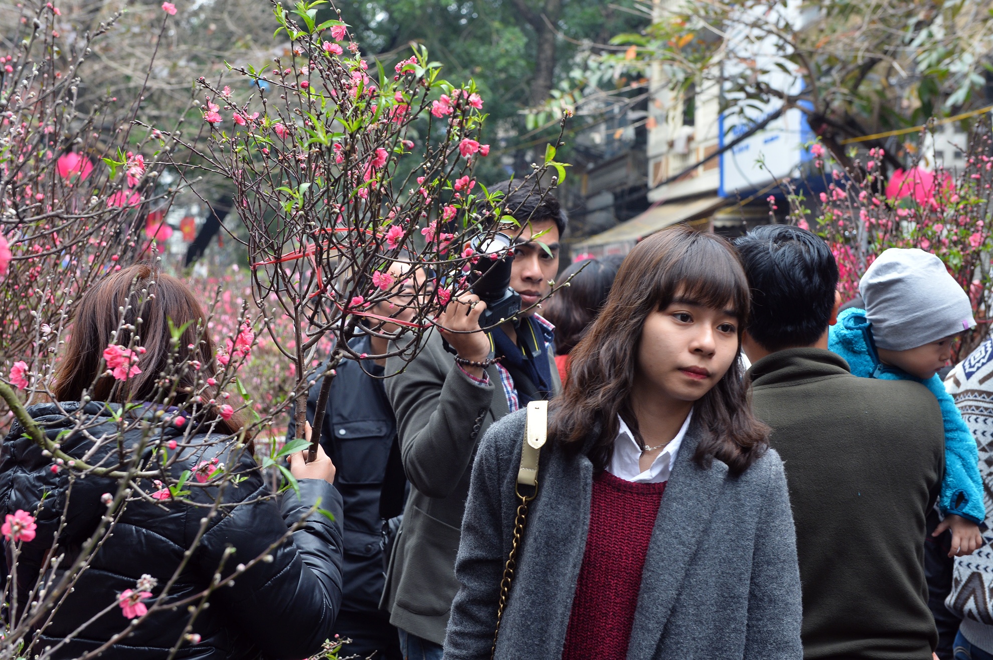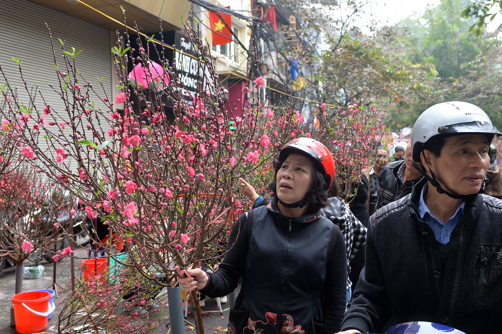 | Mua hoa ở chợ Hàng Lược cũng có ý nghĩa đối với nhiều người. Bạn trẻ Hoàng Hải Yến (áo đỏ) từ huyện Yên Mỹ (Hưng Yên) đi hơn 50km lên thủ đô cuối cùng cũng chọn được cành ưng ý. |