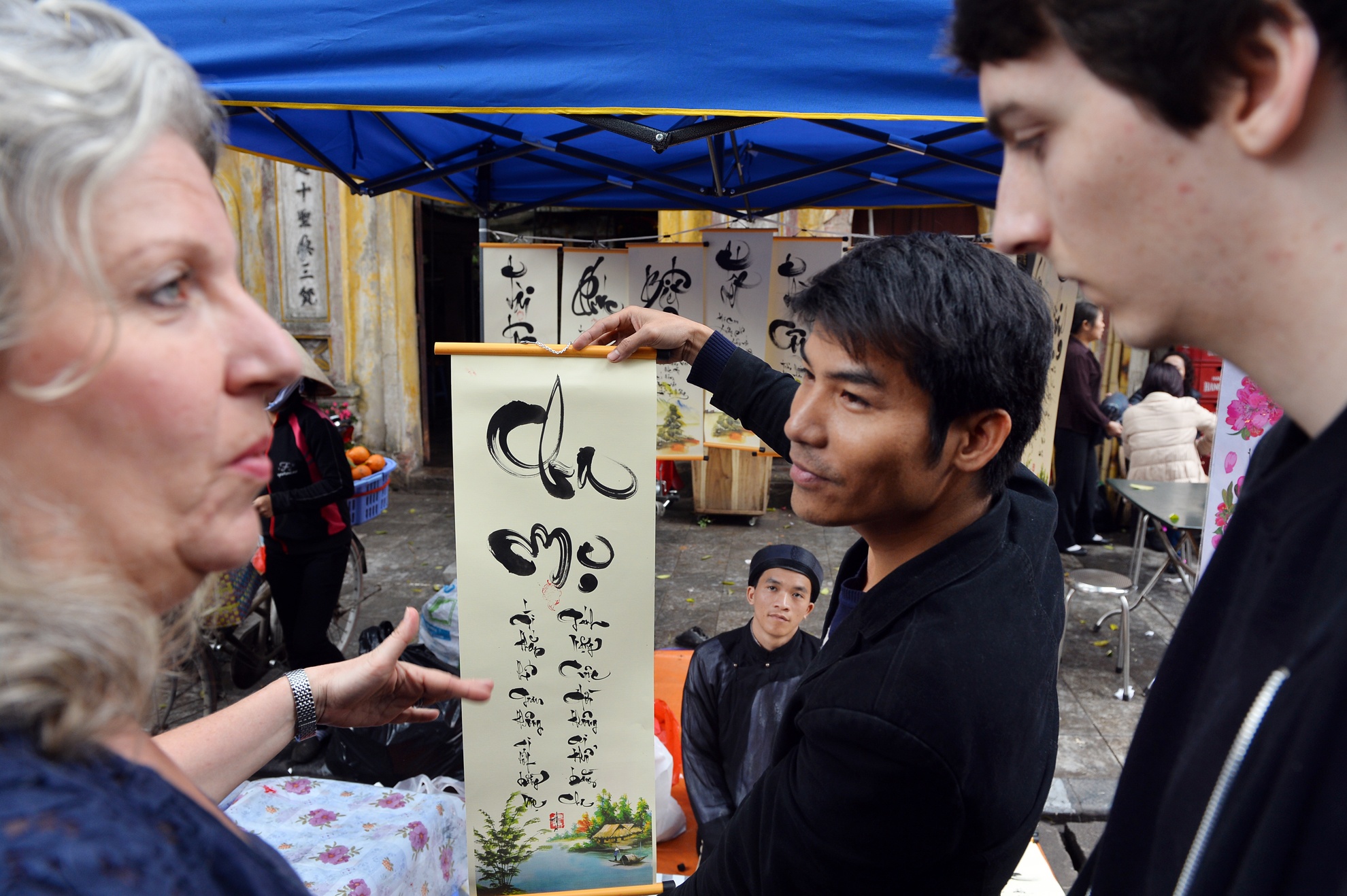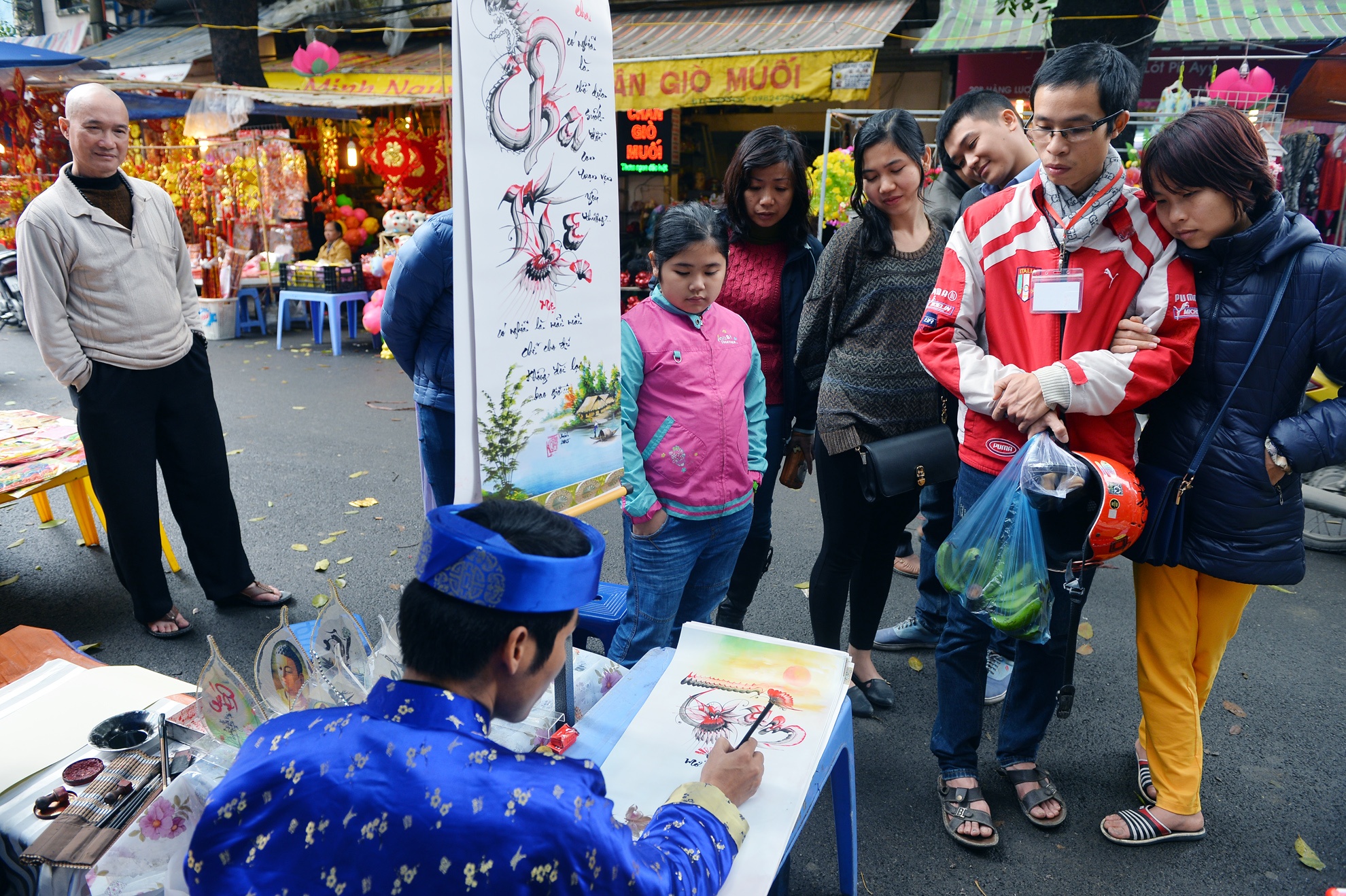 | Quang Tuấn, một 'thầy đồ' trẻ có khả năng vừa phiên dịch, vừa họa, viết thư pháp và làm du lịch cũng chọn một góc nhỏ tại chợ để hành nghề. Mục đích của anh là chia sẻ cái đẹp, cái ý nghĩa đến cho mọi người mà không hoàn toàn vì kiếm tiền mưu sinh. Rất đông khách phải dừng lại xem anh trổ tài vẽ rồng bay, phượng múa với phong cách lạ. |