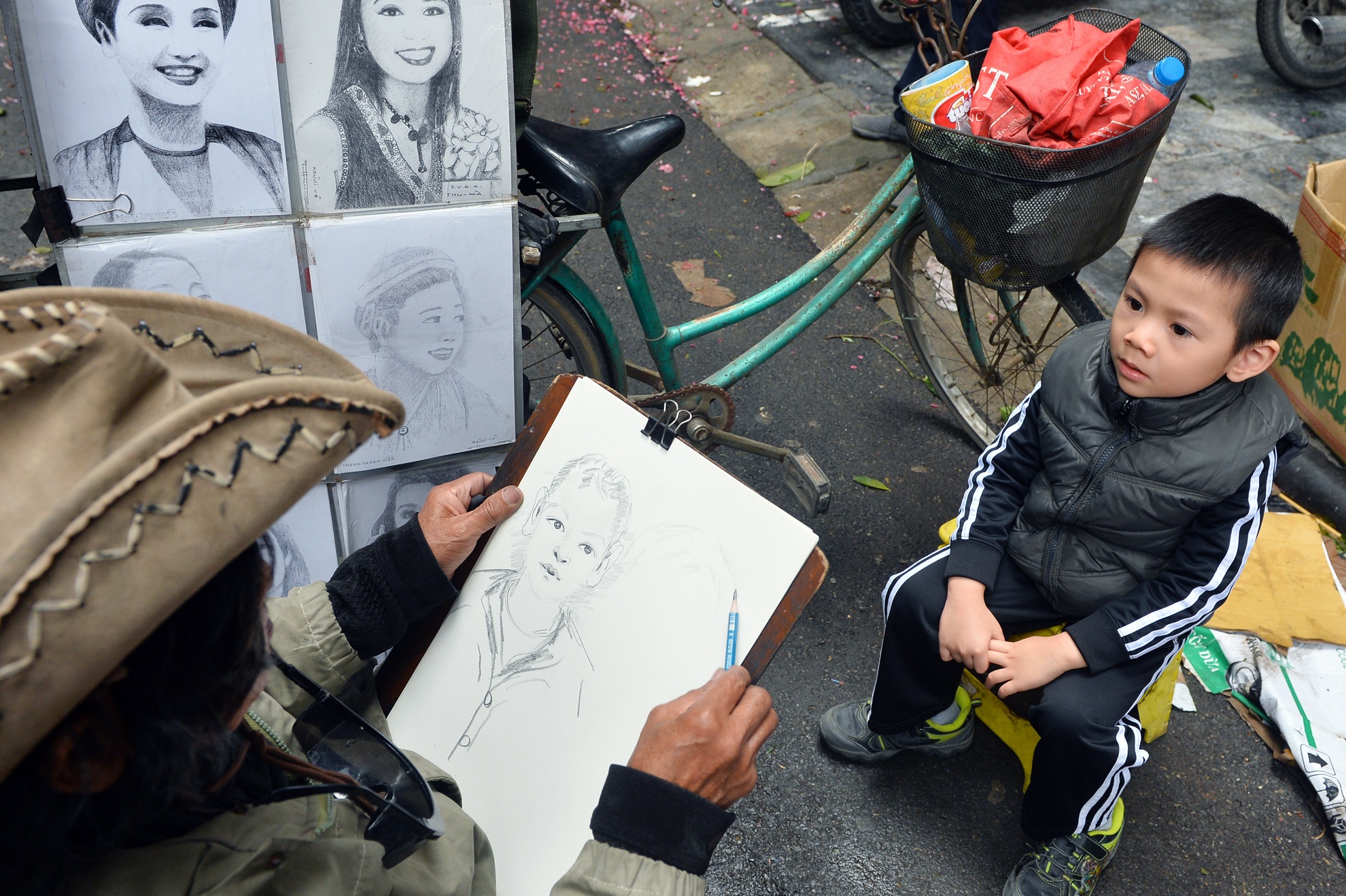 | Bé Kevin Đào (5 tuổi) từ Canada về Hà Nội ăn Tết được mẹ cho ngồi phác họa chân dung giữa chợ. Bé sinh ra ở Việt Nam, được 2 tuổi thì ra nước ngoài định cư cùng gia đình nên chưa biết nhiều về thủ đô. |