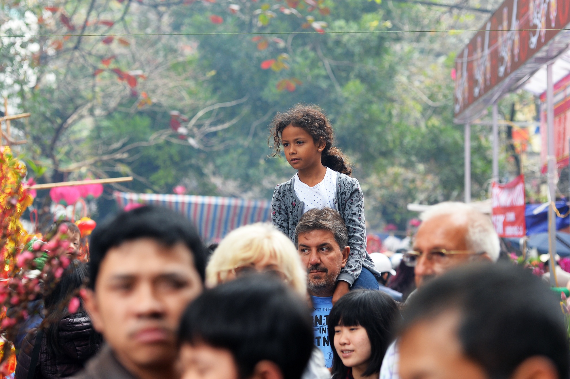 Bé Emilia ngồi lên cổ bố ngắm nghía thấy gì cũng lạ lẫm. Em và gia đình đến Việt Nam du lịch từ Thụy Sĩ và dự kiến sẽ đón giao thừa tại Hà Nội.