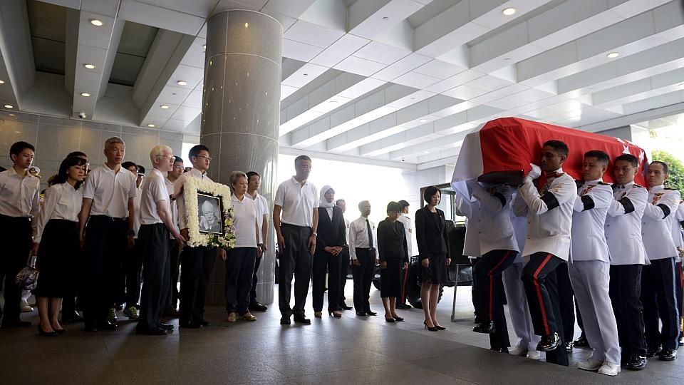 | Quốc kỳ của Singapore được phủ lên linh cữu của ông. |