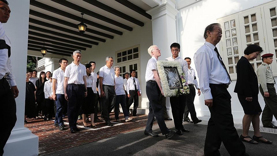 Hai cháu của cố thủ tướng Singapore cầm di ảnh của ông, trong khi đương kim Thủ tướng Lý Hiển Long cùng các thành viên trong gia đình đi phía sau. |