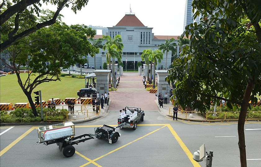 | Xe đại pháo chở linh cữu cựu Thủ tướng Lý Quang Diệu di chuyển vào trong tòa nhà Quốc hội. |
