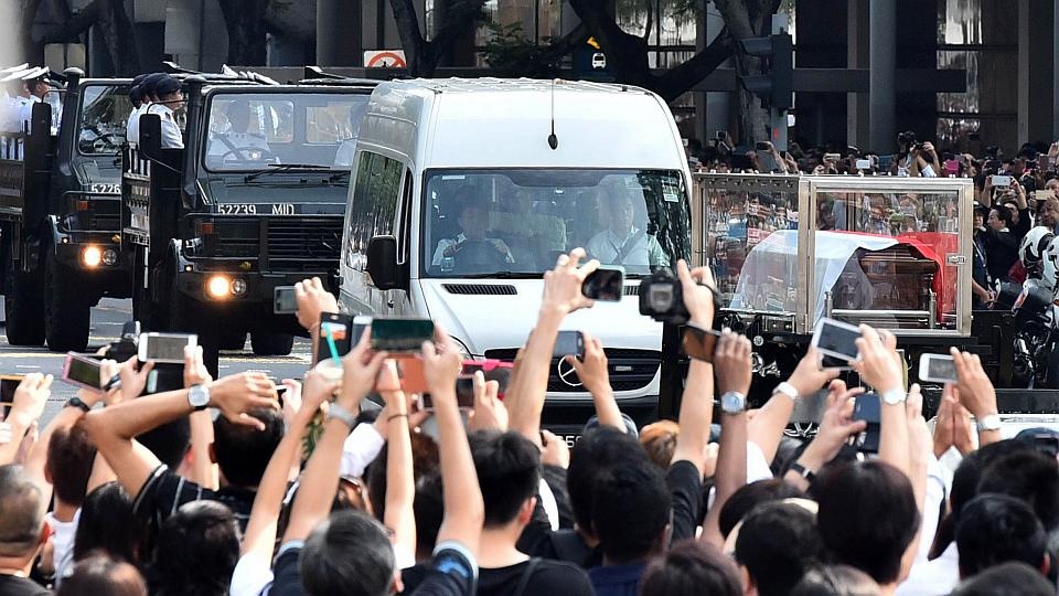 | Xe chở linh cữu ông Lý Quang Diệu di chuyển qua con đường dẫn tới tòa nhà Quốc hội. |