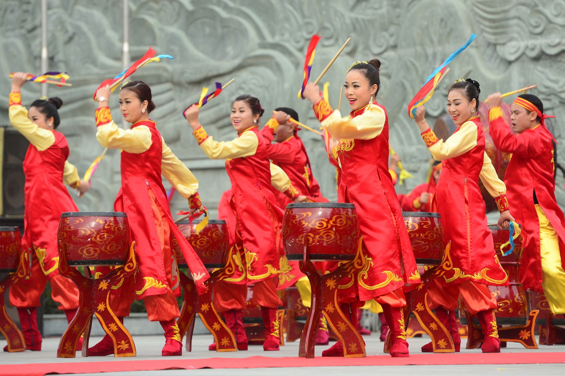 | Tiết mục trống hội Thăng Long rộn rã gợi nhớ ngày chiến thắng hơn 200 năm trước. |
