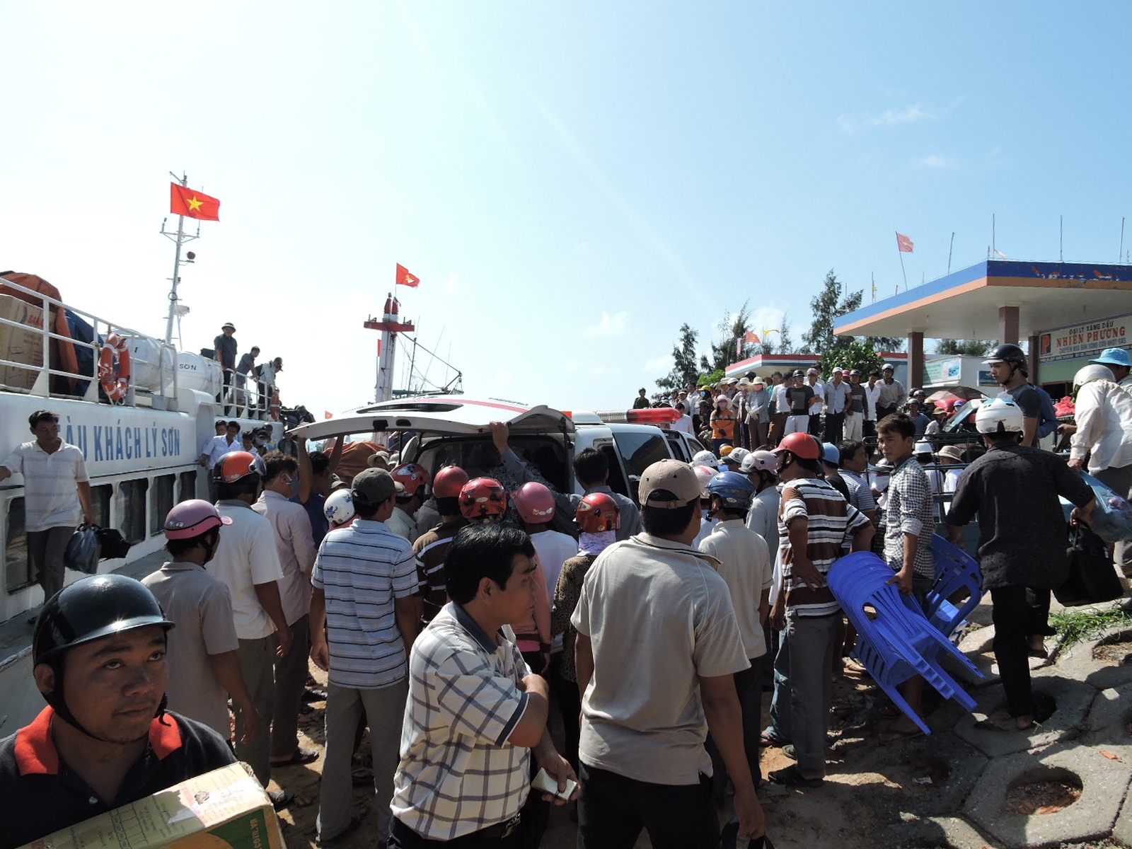 | Nhiều người dân huyện Lý Sơn ra khu neo đậu tàu thuyền đón thi thể anh Tâm. |