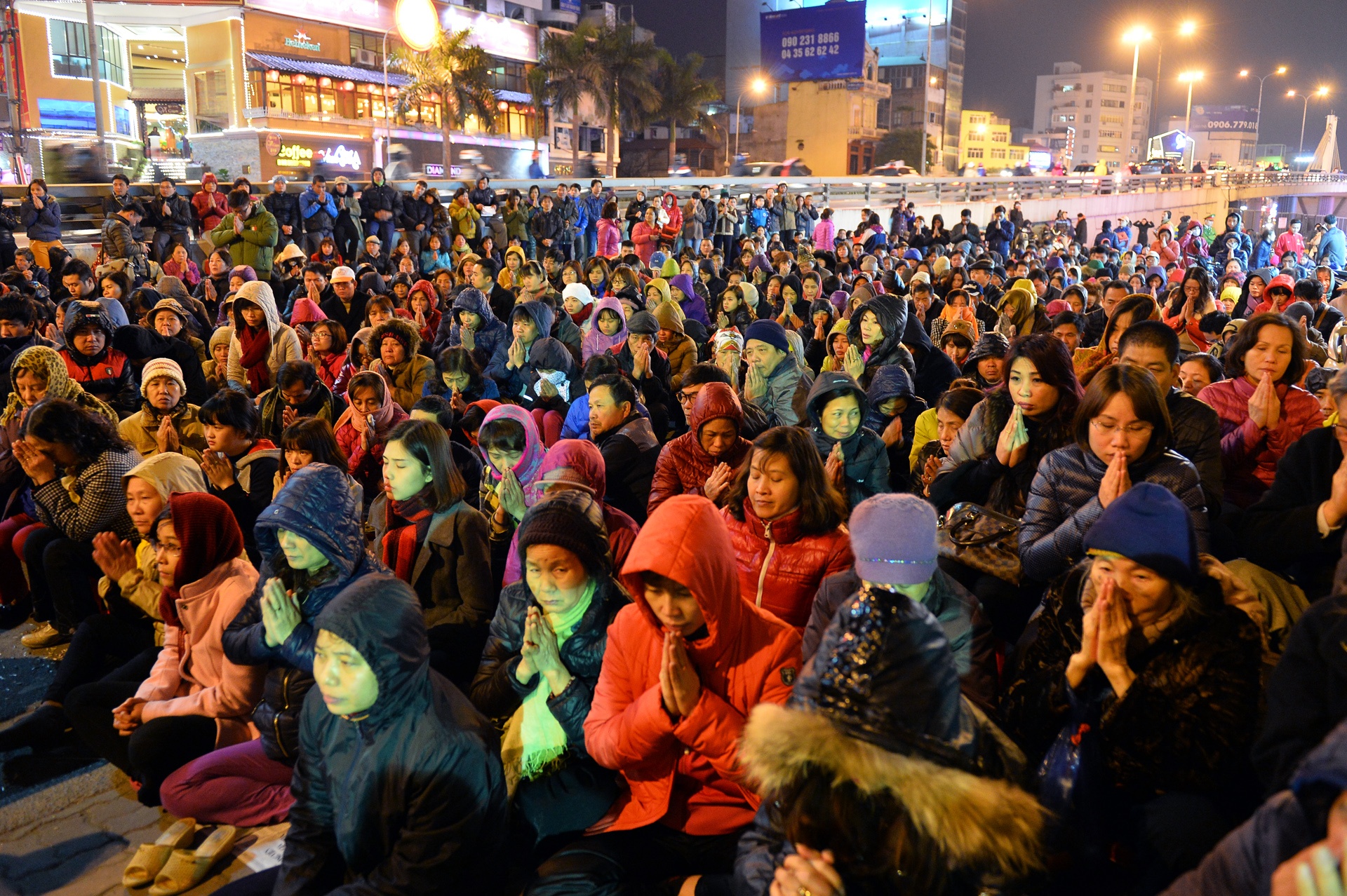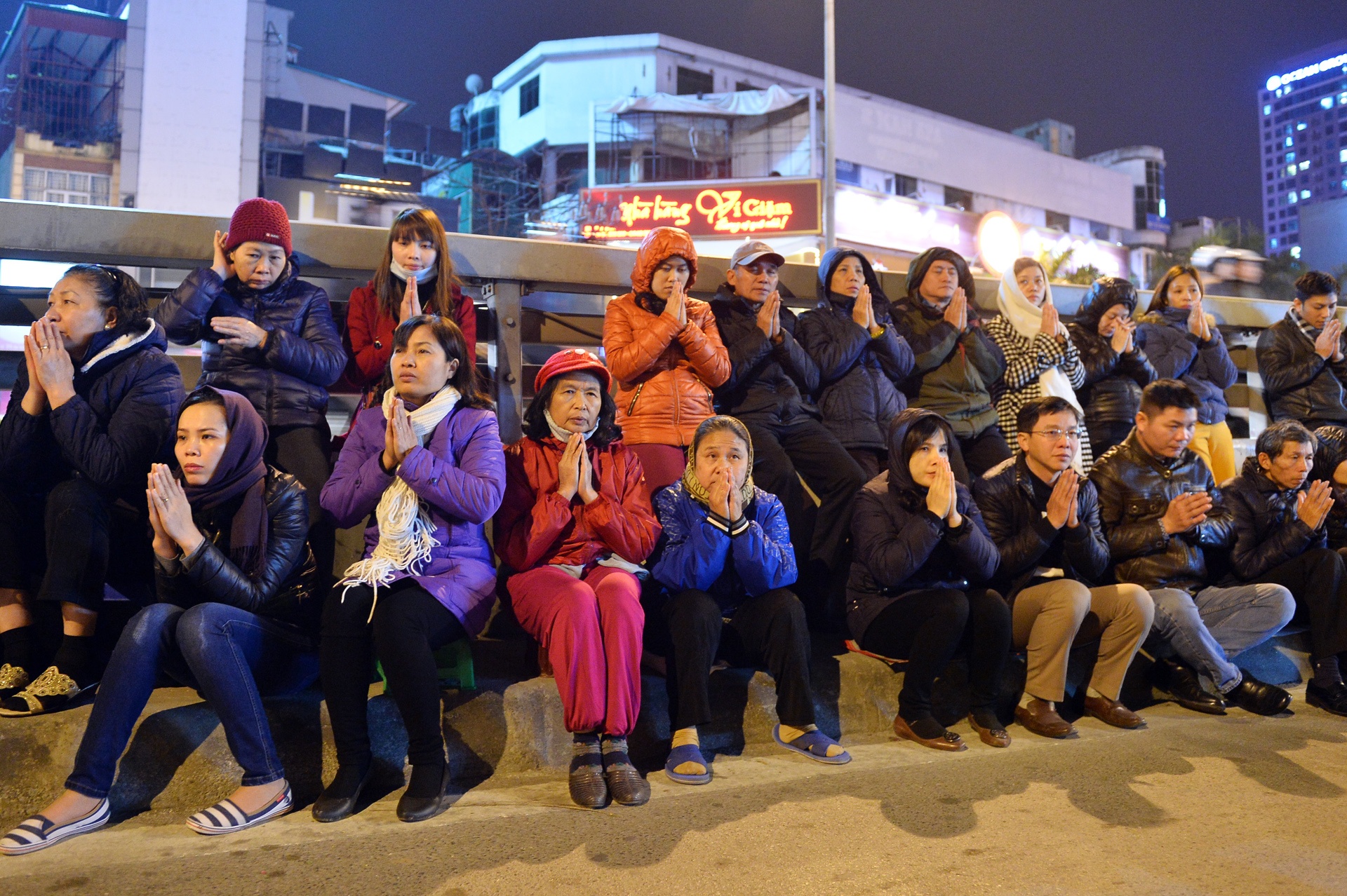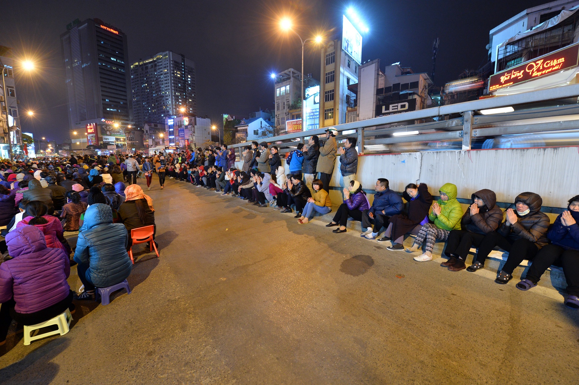Phía ngoài đường Tây Sơn, gần cầu vượt Ngã Tư Sở, người dân đổ về ngồi giữa lòng đường chắp tay vái.