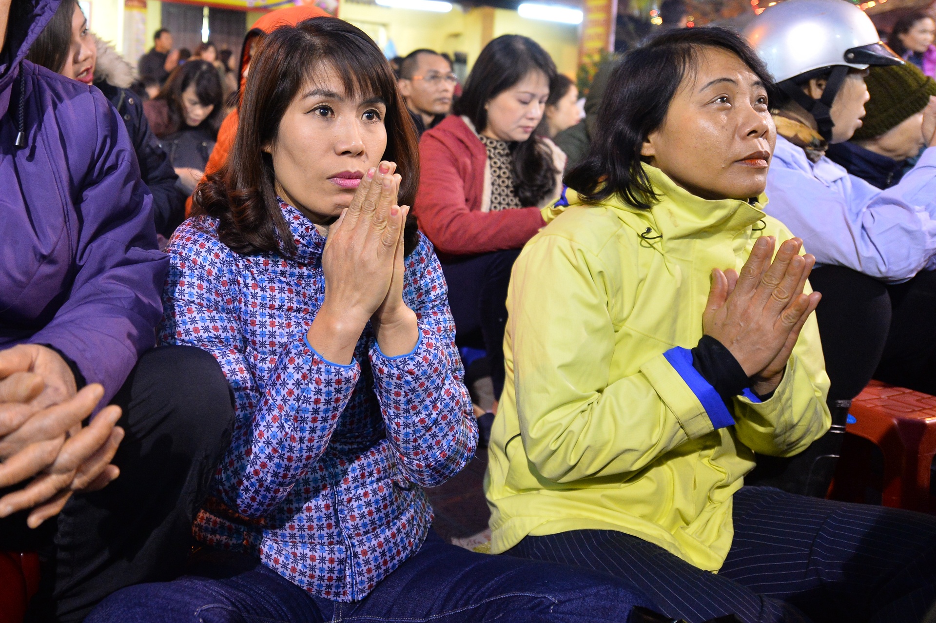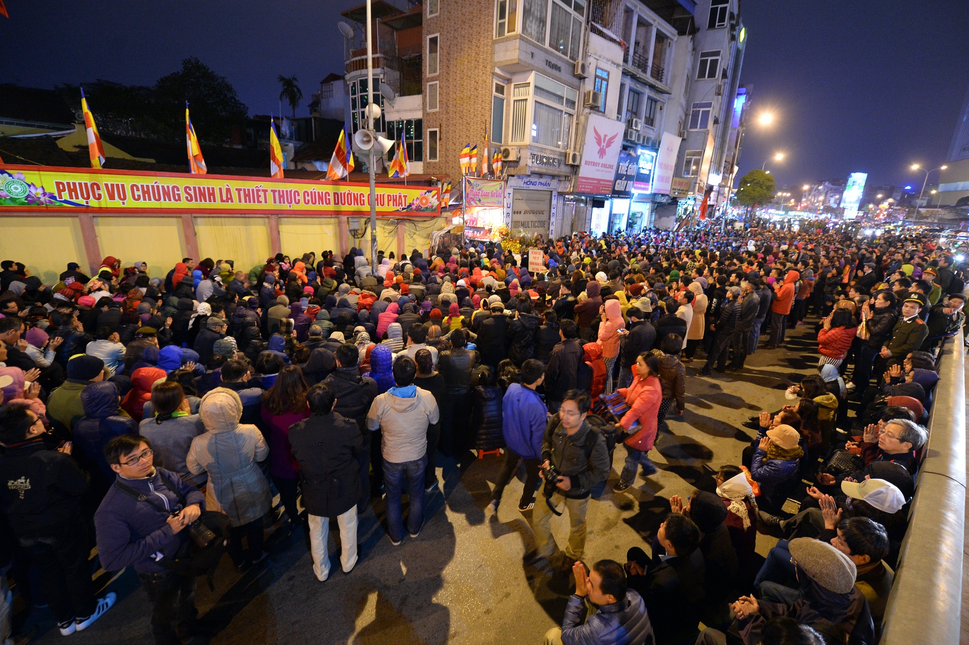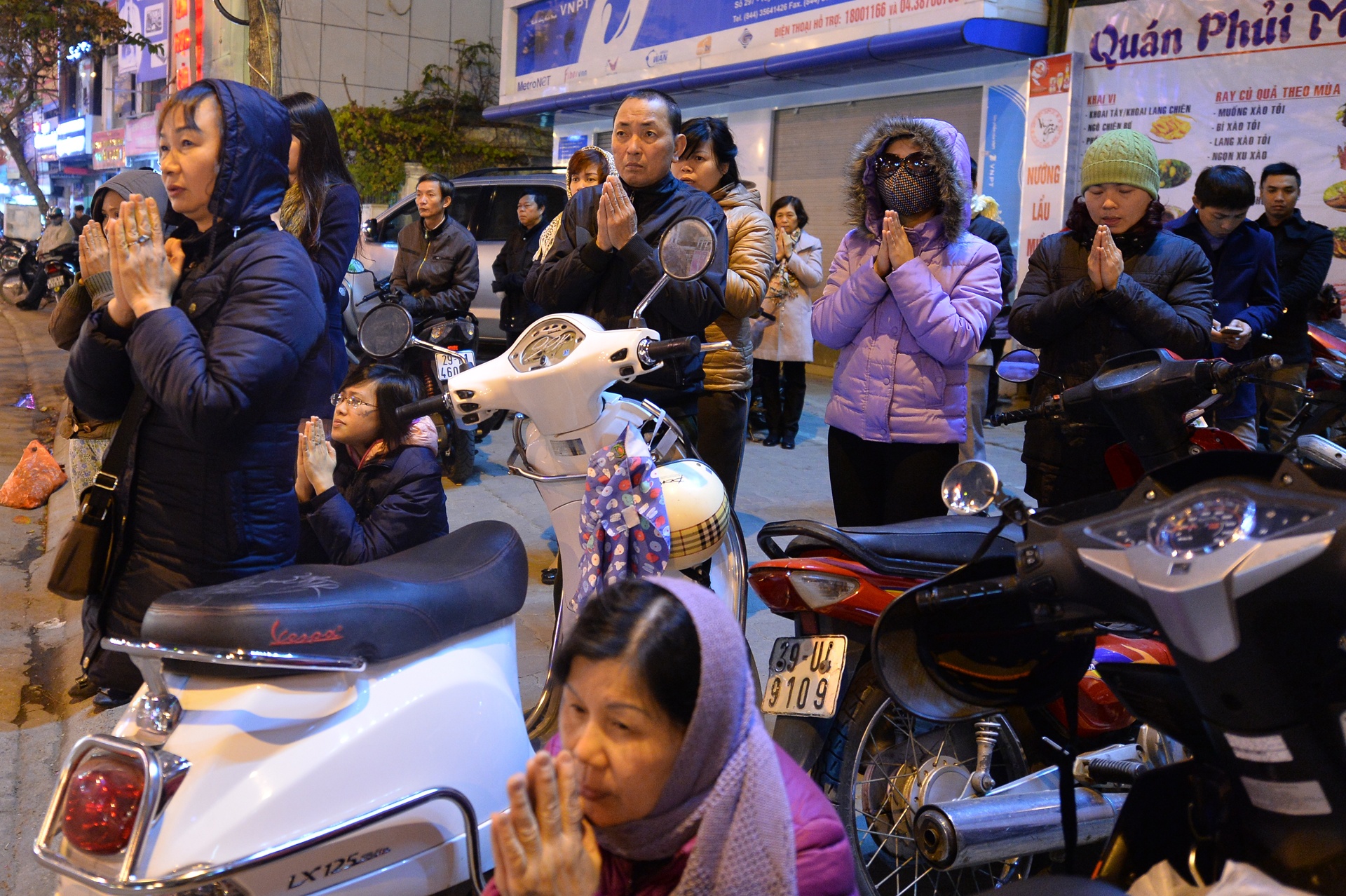Người dân ngồi lòng đường làm lễ giải hạn đầu năm Tối mùng 8 tháng Giêng, hàng nghìn du khách từ các tỉnh và tại thủ đô đổ về chùa Phúc Khánh (Hà Nội) làm lễ giải hạn sao La hầu. Do số lượng quá đông, nhiều người phải ngồi tràn ra lòng đường Tây Sơn.