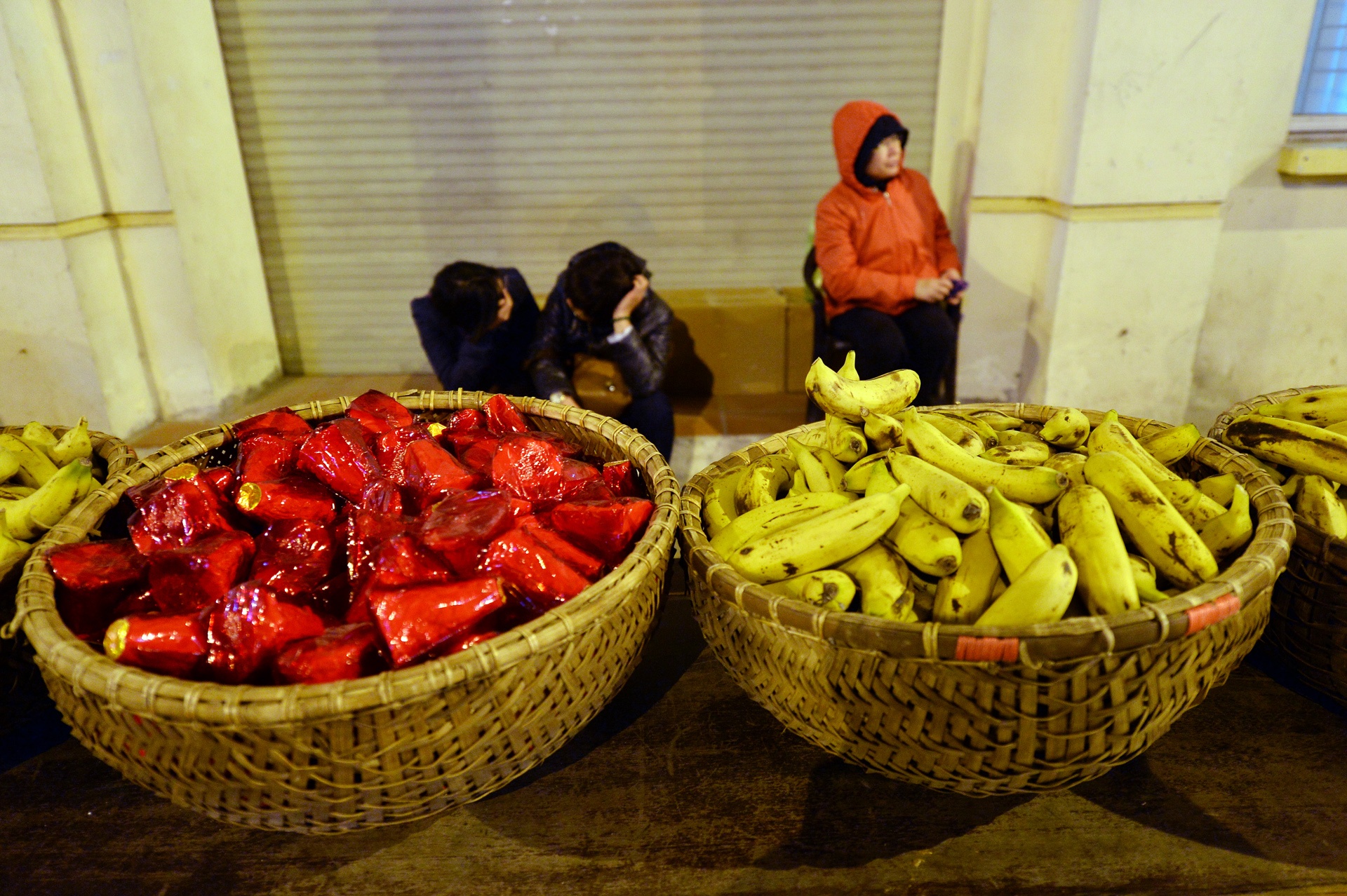 Chuối, oản được bày sẵn chờ tán lộc cho người tham dự.