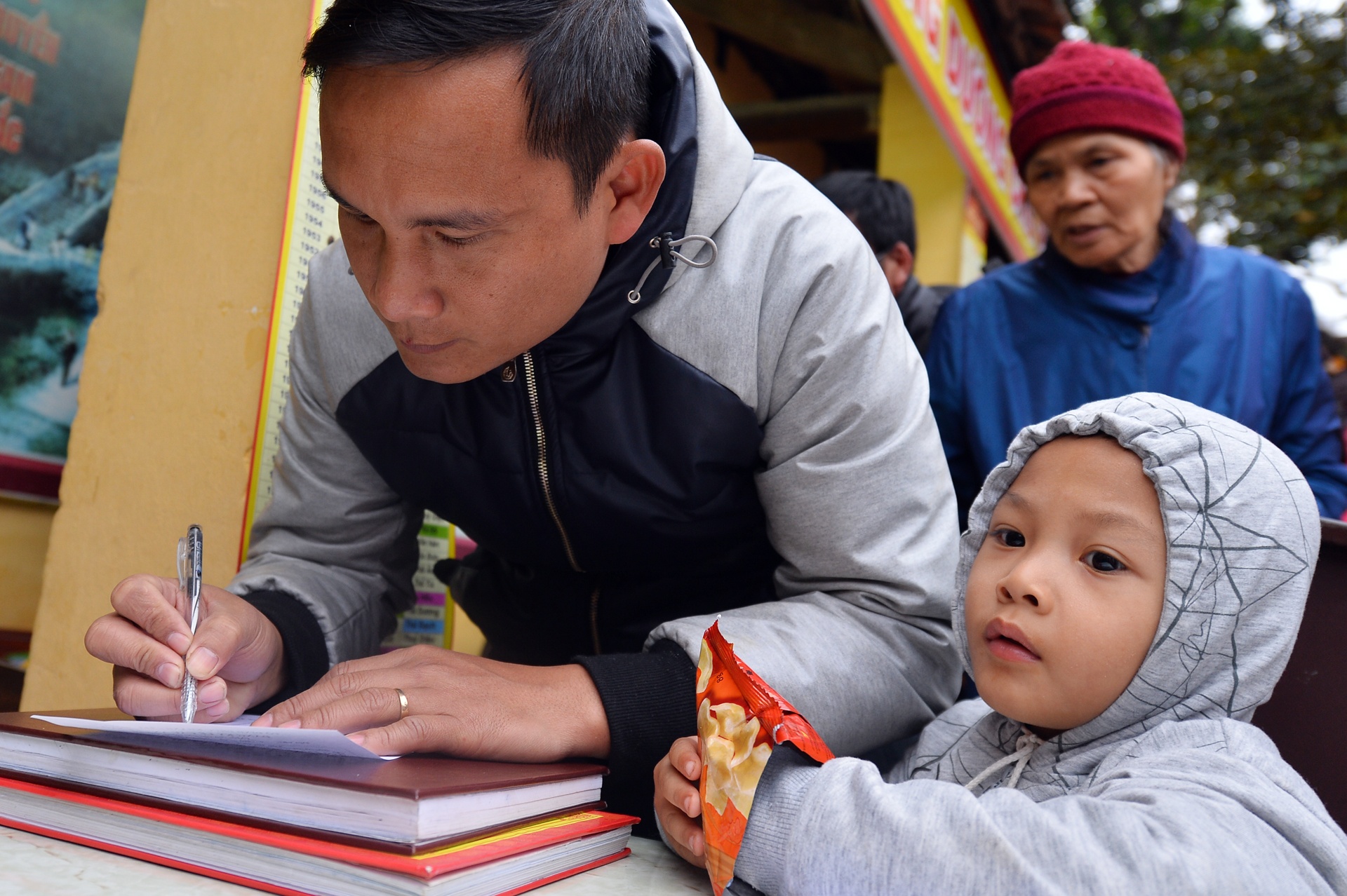 Có nhiều người từ các tỉnh xa cũng về đây làm lễ giải hạn. Trong ảnh là anh Lưu Văn Bình ở Kiến Thụy (Hải Phòng) cùng gia đình tới chùa Phúc Khánh đăng ký. Anh cho biết, vợ sinh năm 1984, mang sao La hầu.