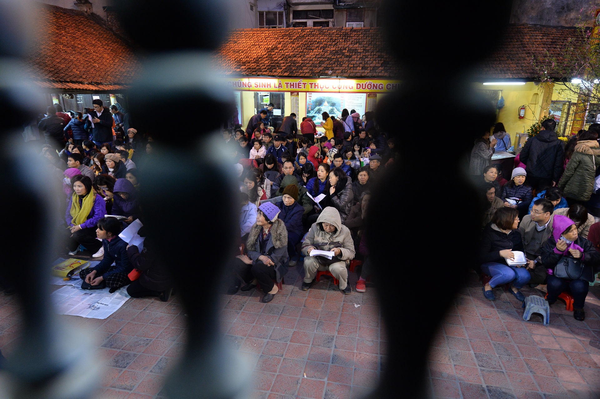 Những người đến sớm được ngồi đàng hoàng giữa sân chùa.