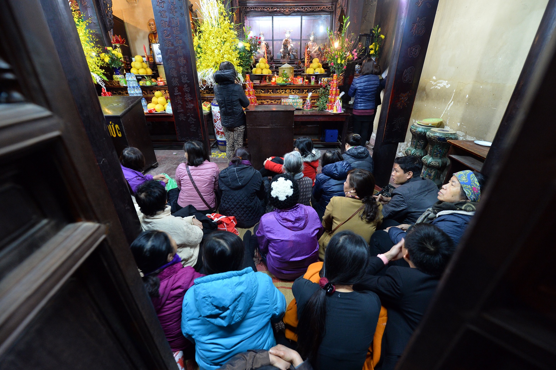 Bên trong chùa chính, nhiều người súy chỗ đẹp đợi đến giờ nhà sư tụng kinh gõ mõ.