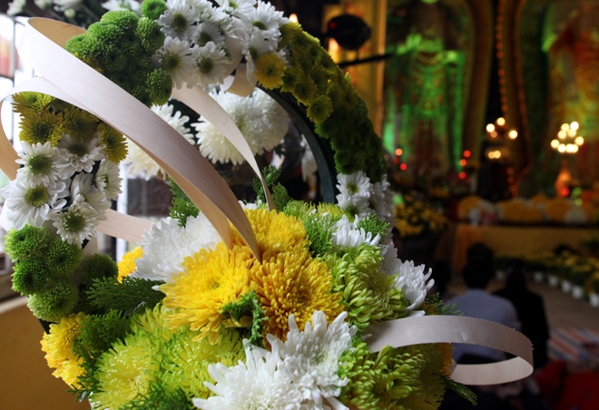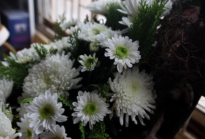 Những bông hoa cúc trên giỏ với các màu vàng, trắng, phớt xanh, tỏa hương thơm.