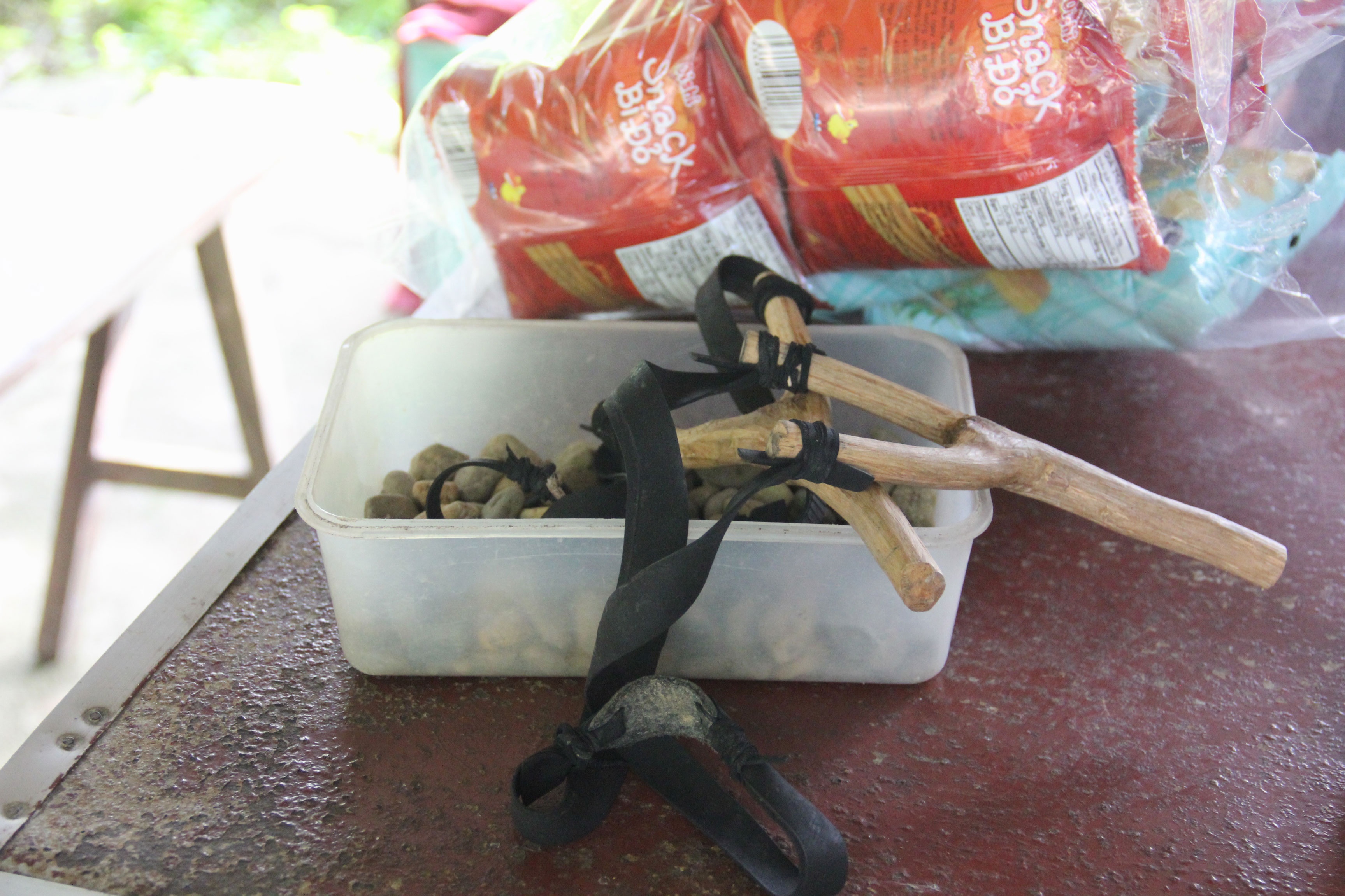 | "Vũ khí" đuổi khỉ tại các quầy hàng ở đây là súng cao su. Ảnh: Ngọc Lan. |