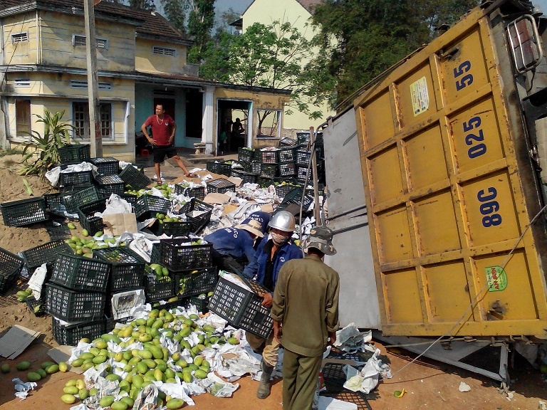 Tuy nhiên, lúc này bên trái đường có xe máy BKS 92N do ông Nguyễn Huy Tú (SN 1942, trú phường An Mỹ, TP.Tam Kỳ, Quảng Nam), lưu thông hướng Tam Kỳ - Núi Thành, nên tài xế Khánh hoảng hốt bẻ ngược tay lái lại khiến xe tải lật nhào bên đường, hàng tấn xoài đổ ra ngoài.