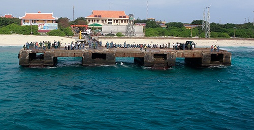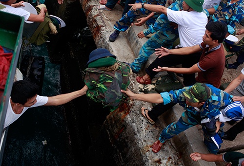 | Cán bộ, chiến sĩ trên đảo Trường Sa Lớn đón chào đoàn công tác tại cầu cảng. |