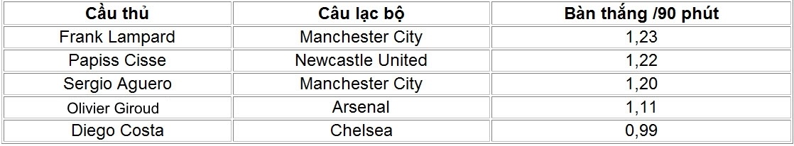 Tuy nhiên nếu xét về hiệu suất làm bàn, Aguero chưa phải là chân sút xuất sắc nhất. Ở tiêu chí này, Frank Lampard mới là chân sút lợi hại nhất khi ghi được 4 bàn với hiệu suất 1,23 bàn/trận. Xếp ngay sau anh là Papiss Cisse với hiệu suất chỉ kém đôi chút là 1,22 bàn/trận nhưng ghi nhiều bàn gần gấp đôi Lampard (7 bàn).